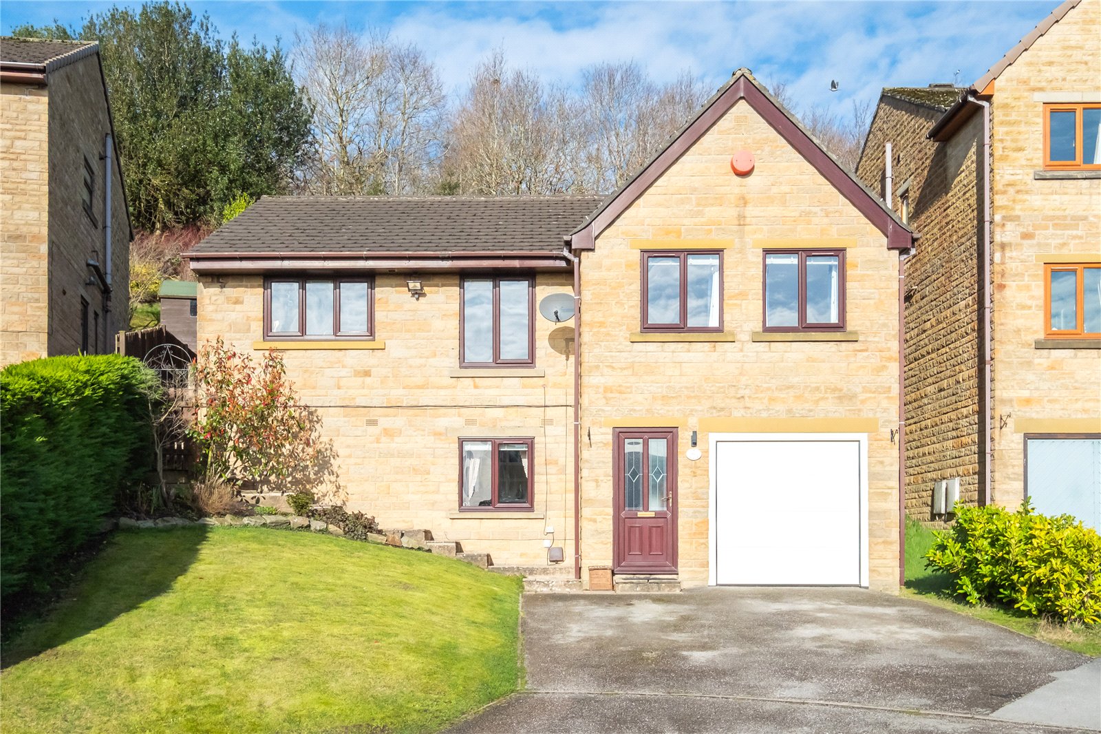 This 3/4 bedroomed detached home occupies a lovely location at the head of the cul-de-sac and takes in some fabulous far-reaching views from its elevated position. The property was built in the early 1990’s and now provides spacious family sized accommodation including a home office/bedroom 4 off the ground floor entrance hall, large integral garage, and then steps rise to the main hall which gives access to the living room, dining kitchen, 3 double bedrooms, and bathroom. It has gas fired central heating and double glazing. Externally, there is a tarmac driveway and lawned garden to the front, and sizeable patio and gardens to the rear. It is within walking distance of the village centre where you will find an array of shops and amenities, a regular bus service, and only a short drive to Junctions 23 & 24 of the M62.