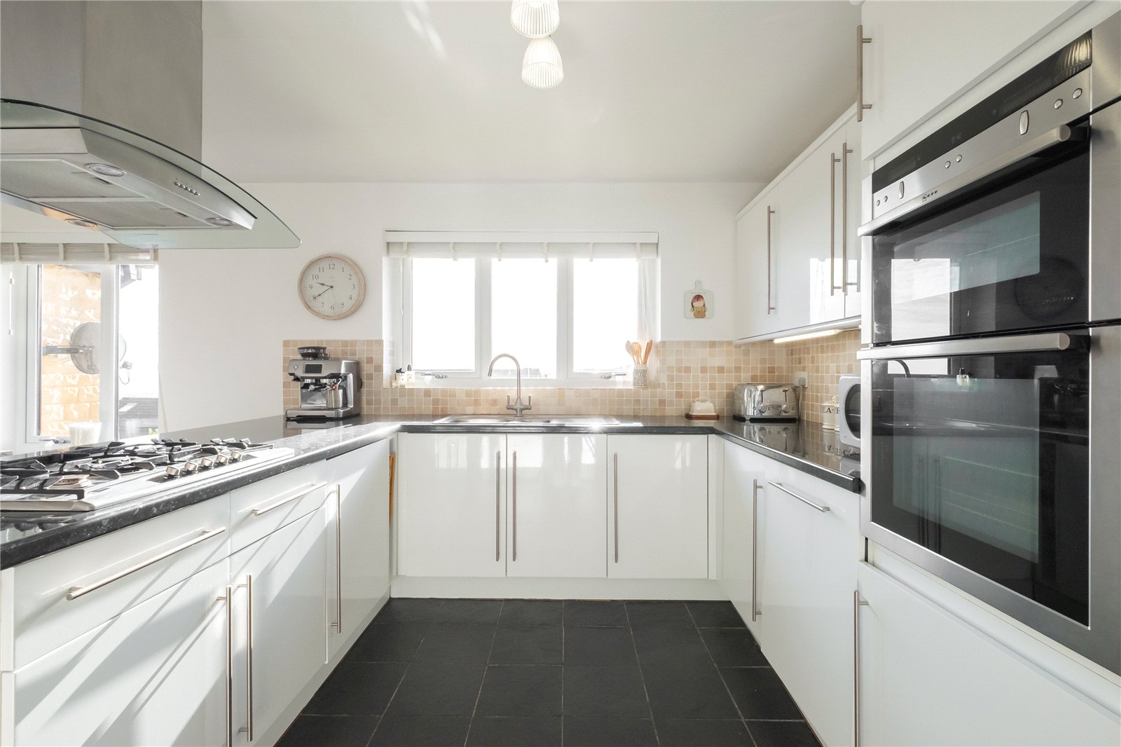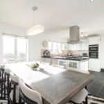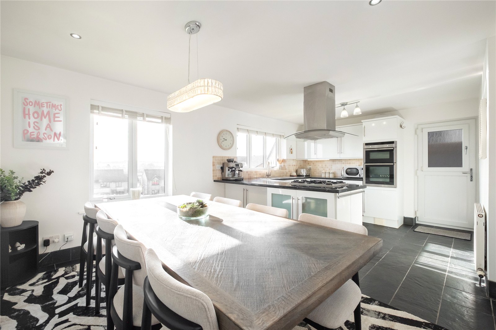 Fitted with a range of wall and base units having ample worksurfaces over incorporating a 1½ bowl stainless steel sink with mixer tap. Integrated appliances include a 5-ring gas hob with extractor hood over, double ovens and grill, dishwasher, fridge, and freezer. There are tiled splashbacks, tiled floor, stable style door to the side, a spacious living/dining area, and amazing views to the front.