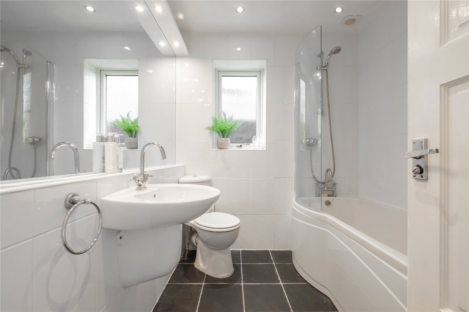 Fitted with a white suite comprising a ‘P’ shaped bath with shower and screen over, wall mounted wash basin with mixer tap, and a corner low flush w.c. There is a large mirror running across the wash basin wall with lights within the pelmet, inset ceiling spotlighting, tiled walls and floor, frosted window to the side, extractor fan, shaver socket, ladder style radiator, and a shelved storage cupboard.