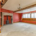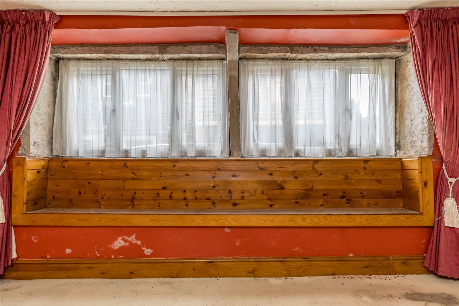 A very good sized room with stone mullioned windows to the front with fitted seating beneath, beams, and a stove set into the chimney breast with sturdy stone mantel and sides.