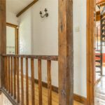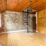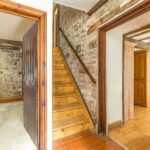 With tiled floor, beams, exposed stone wall, and staircase rising to the first floor.