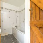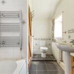 Fitted with a white suite comprising a low flush w.c., panelled bath, and pedestal wash basin.  There is a frosted window to the side, and cupboard housing the central heating boiler.