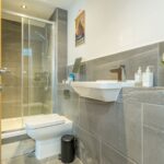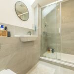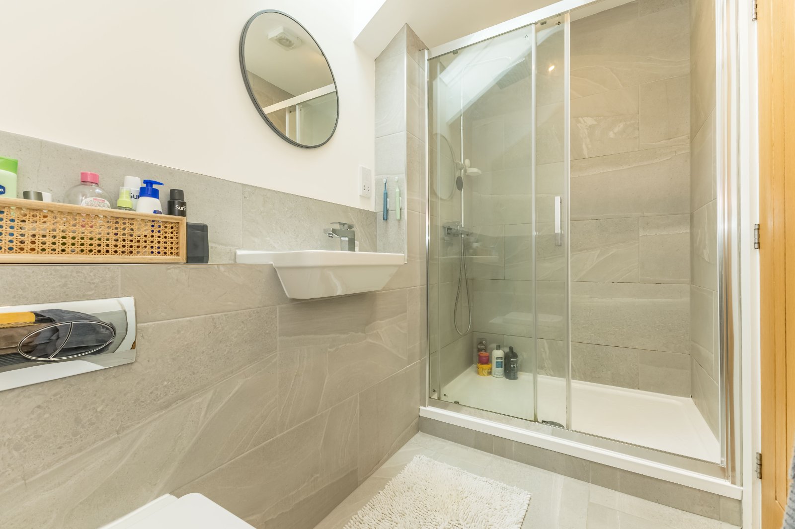 Having a three piece suite in white comprising low flush wc, washbasin and shower cubicle, tiled floor, partly tiled walls, heated towel rail, inset spotlights and rooflight to the ceiling and extractor.