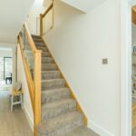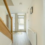 With glazed entrance door and further full height glazed panel to the side, stairs to the first floor with glazed balustrade, understairs cupboard and central heating radiator.