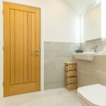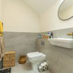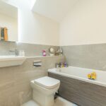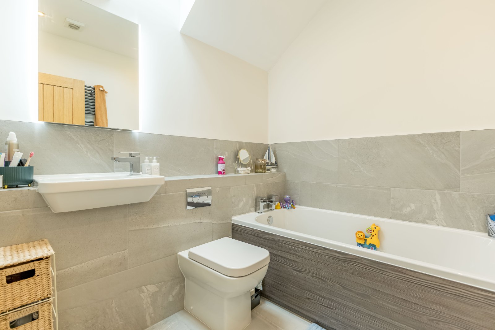 With modern three piece suite in white comprising low flush wc, washbasin and bath, partly tiled walls, tiled floor, heated towel rail, inset spotlights and rooflight to the ceiling.