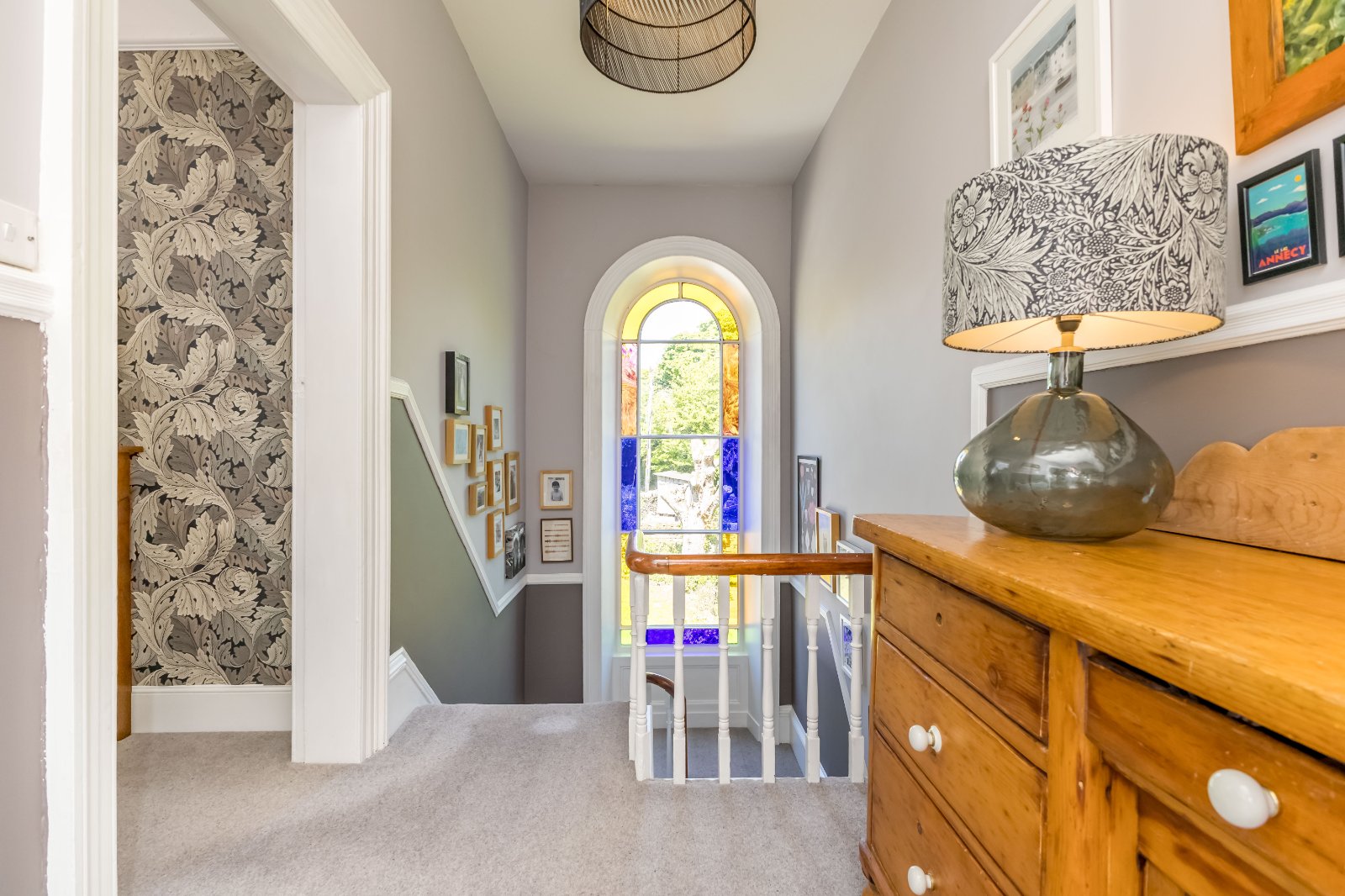 On the upper floor there is a large landing area overlooking the beautiful arched window on the rear elevation which features coloured glazed panels. The principal bedroom overlooks the garden and also features built-in wardrobes to either side of the chimney breast. Next door to this bedroom, there is a house bathroom tasteful modern fittings in a traditional style. A lobby area off the landing gives access to 2 further double bedrooms one of which has its own en-suite shower room.