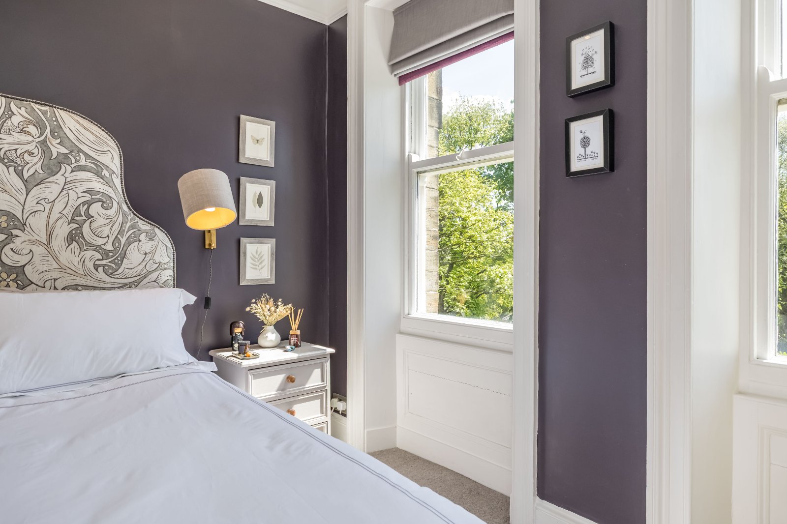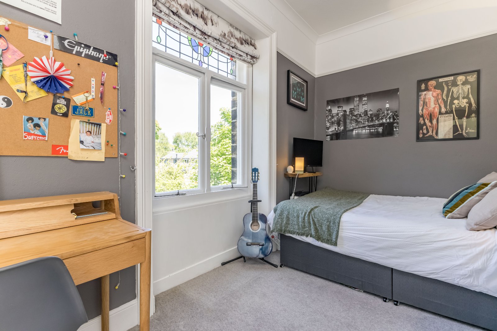 A large double bedroom which features 2 sash windows to the front and further window to the side enjoying the views, chimney breast with cupboards to either side and 2 tall column radiators.