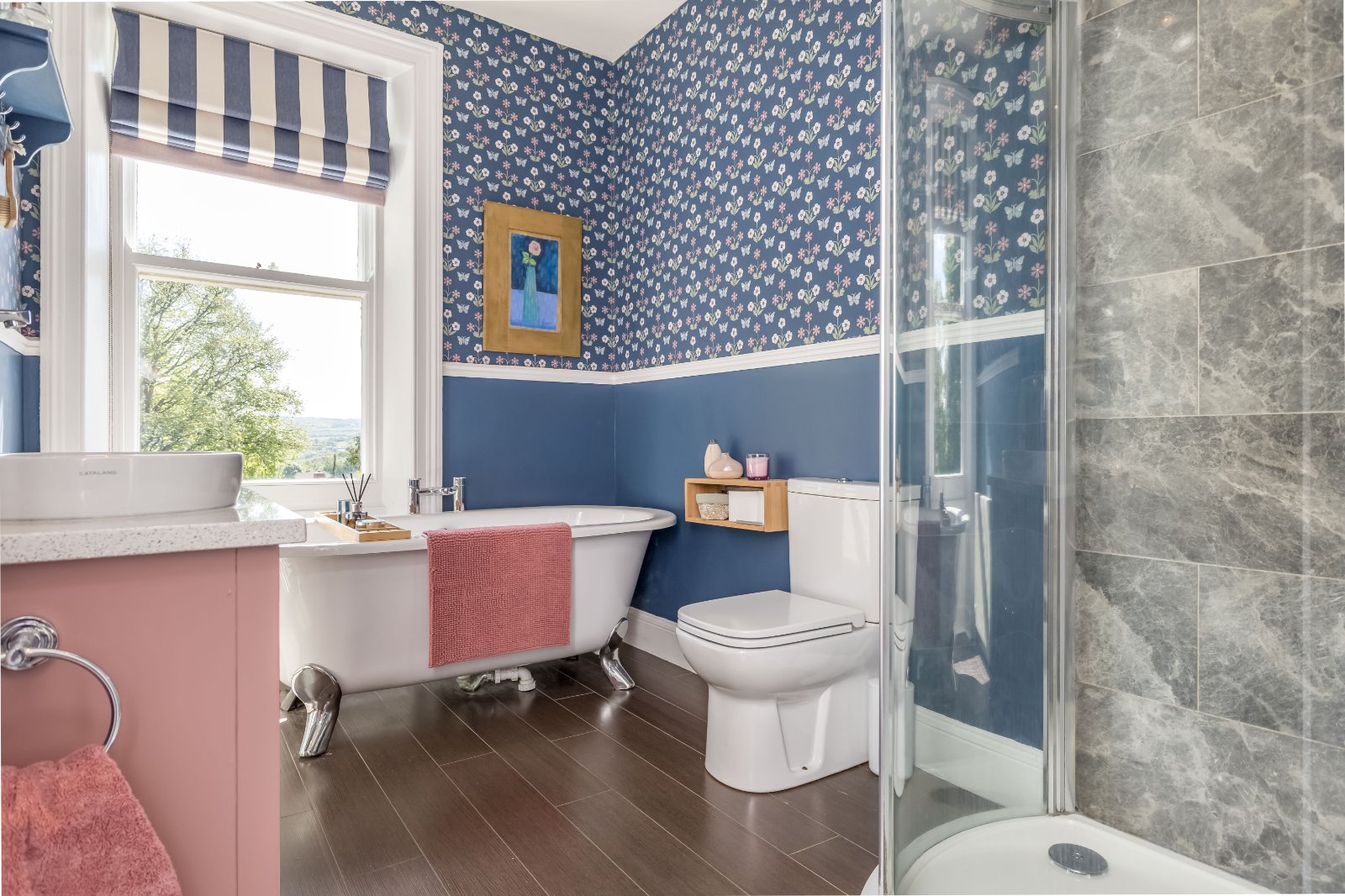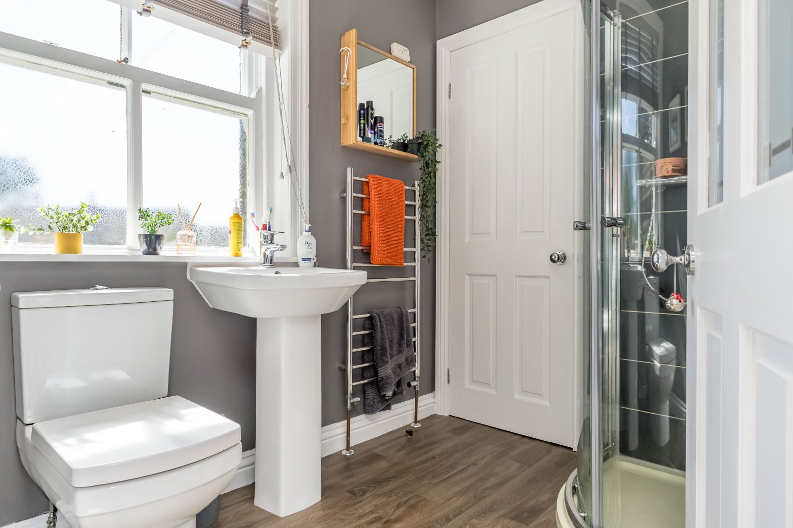 A good sized house bathroom with low flush WC, washbasin with painted wooden vanity unit, free standing bath shower enclosure, laminated wood flooring, sash window to the front, column radiator and inset spotlights to the ceiling.