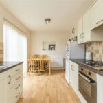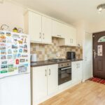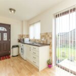 Nicely fitted with a range of modern wall, drawer, and base units with work surfaces over incorporating a 1½ bowl stainless steel sink with mixer tap. There is a 4-ring gas hob with extractor hood over and an electric oven beneath, plumbing for a washing machine, space for a fridge/freezer, and a full height storage cupboard with shelves. You will also find tiled splashbacks, wood effect flooring, an external door to the side, and window and sliding patio doors to the rear.