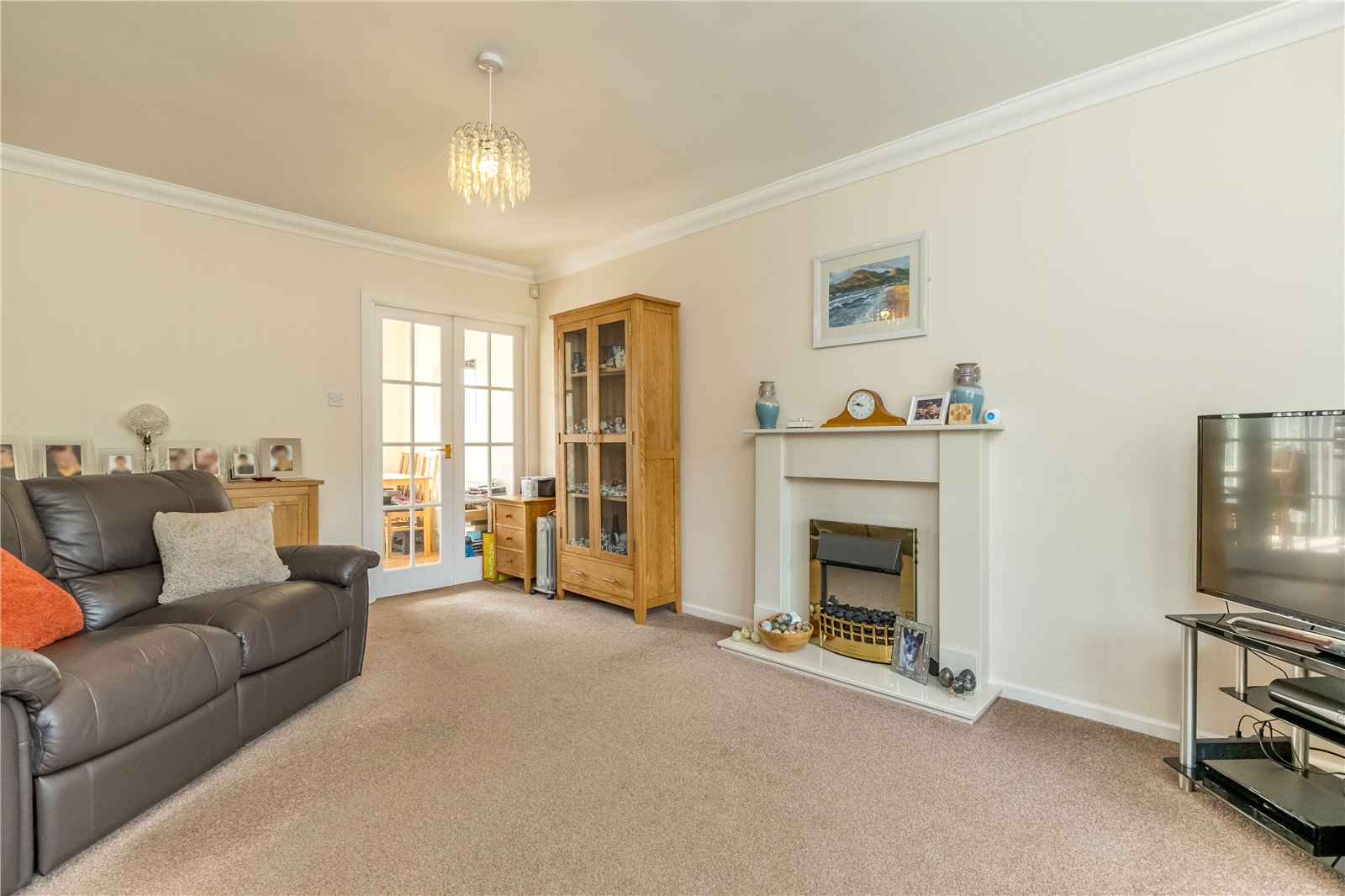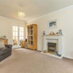 Having an electric fire in modern marble surround and hearth, bow window overlooking the front garden, and a very useful under stairs storage cupboard. A pair of glazed doors lead through to:-
