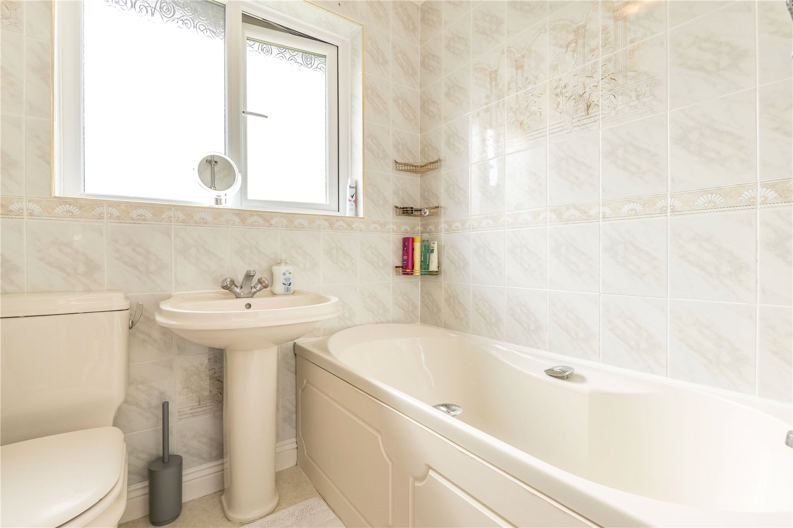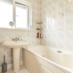 Fitted with a cream suite comprising panelled bath with mixer tap and shower attachment over, low flush w.c., and pedestal wash basin. It is finished with tiled walls, and has a frosted window to the rear.