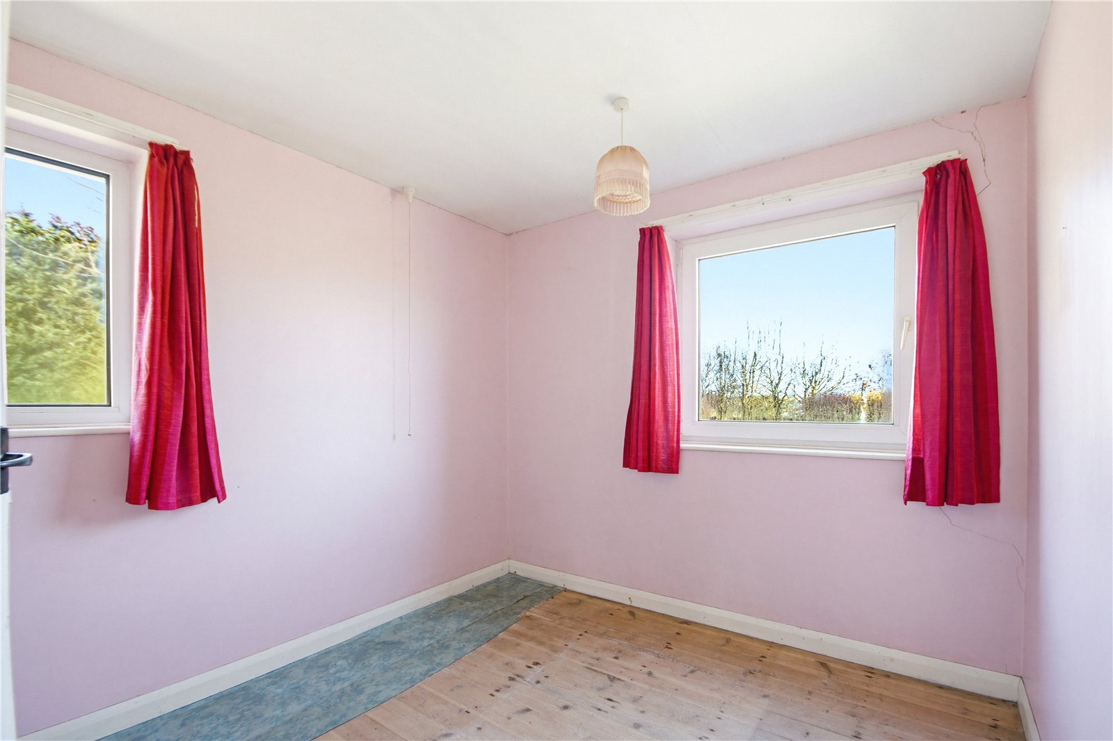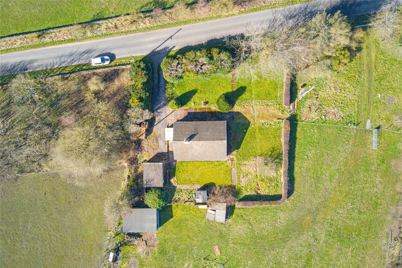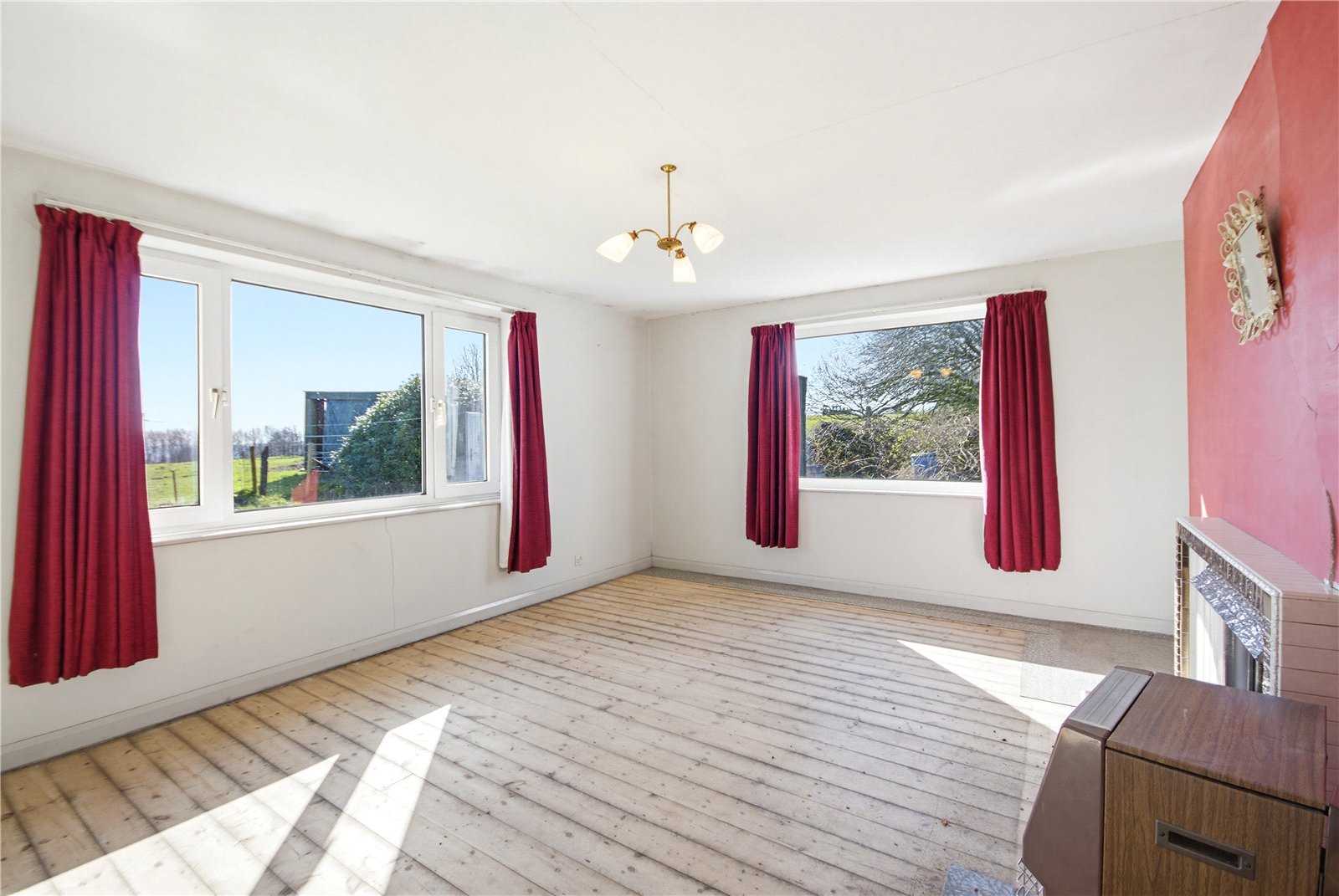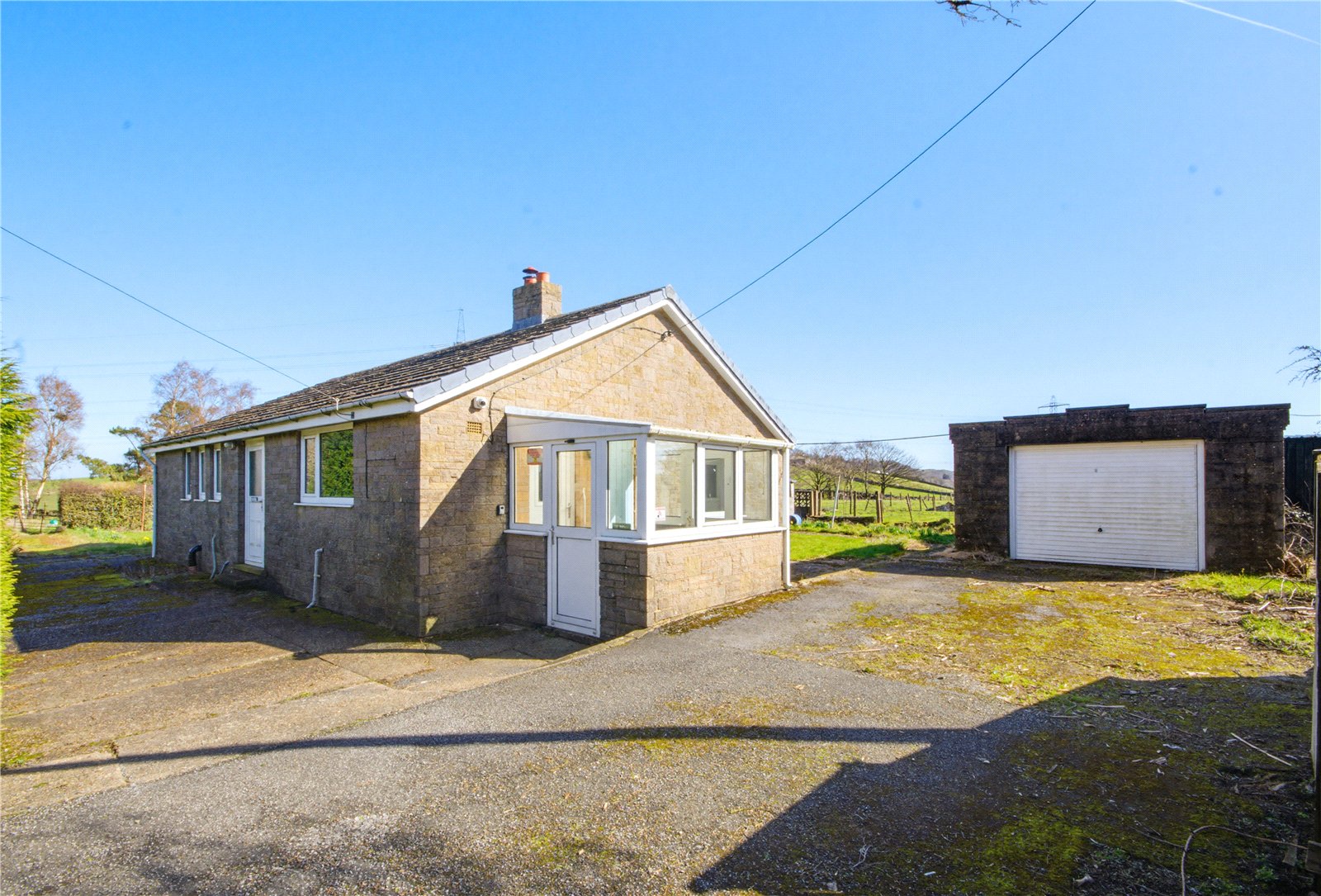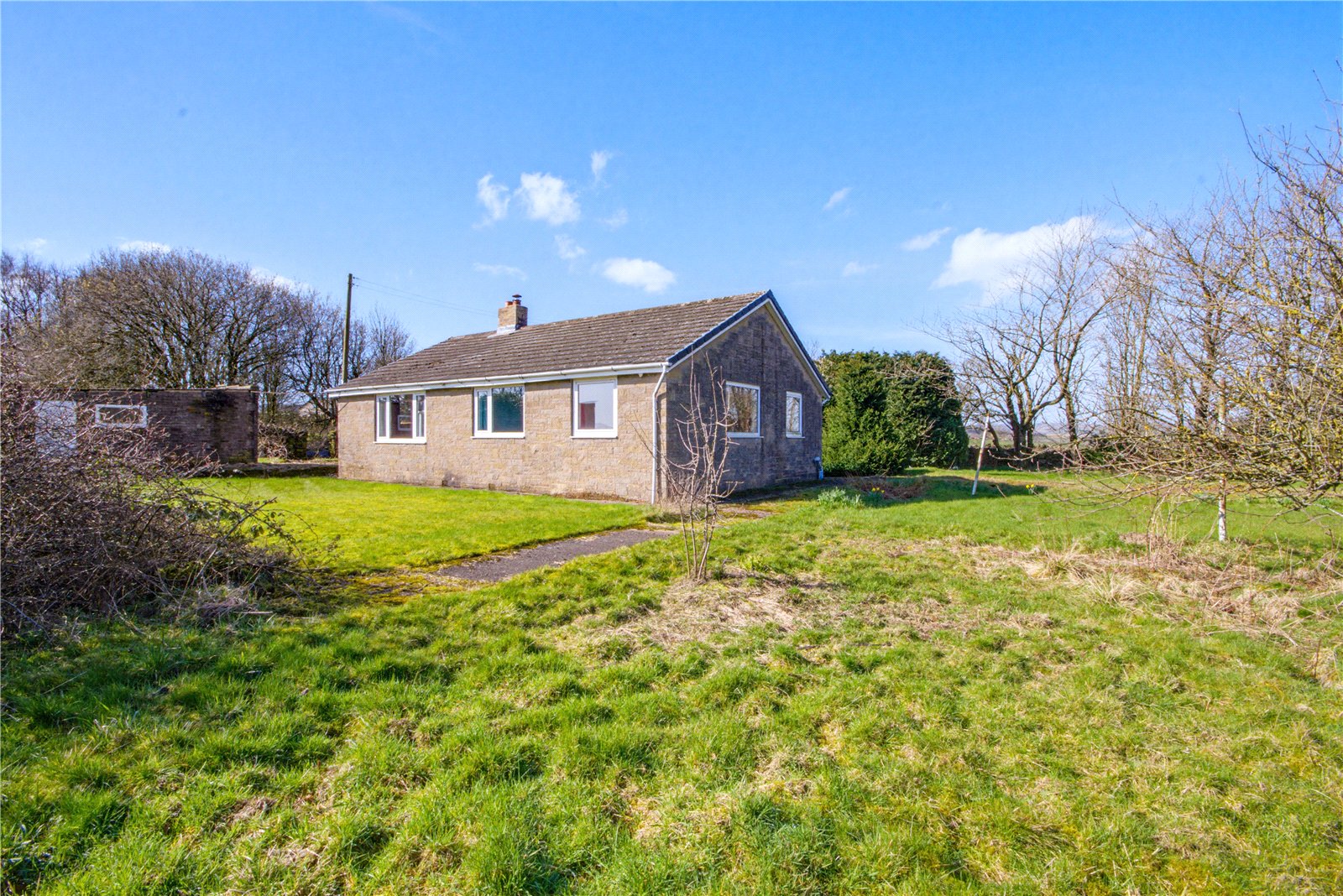 Enjoying a superb rural setting with views over fields, this detached true bungalow offers an excellent opportunity to renovate and redesign to the next owners’ tastes. It is offered for sale on the open market for the very first time. The accommodation comprises: entrance lobby, hall, large lounge, dining kitchen, side porch, 3 good sized bedrooms, bathroom and separate wc. It has the benefit of uPVC double glazing and has a relatively modern bathroom, but we expect that the next owner will look to carry out extensive refurbishment. Externally, there are generous gardens to the front, side and rear with a driveway leading to a detached garage at the side – the total plot extending to approximately 0.31 acres. For sale with no vendor chain.