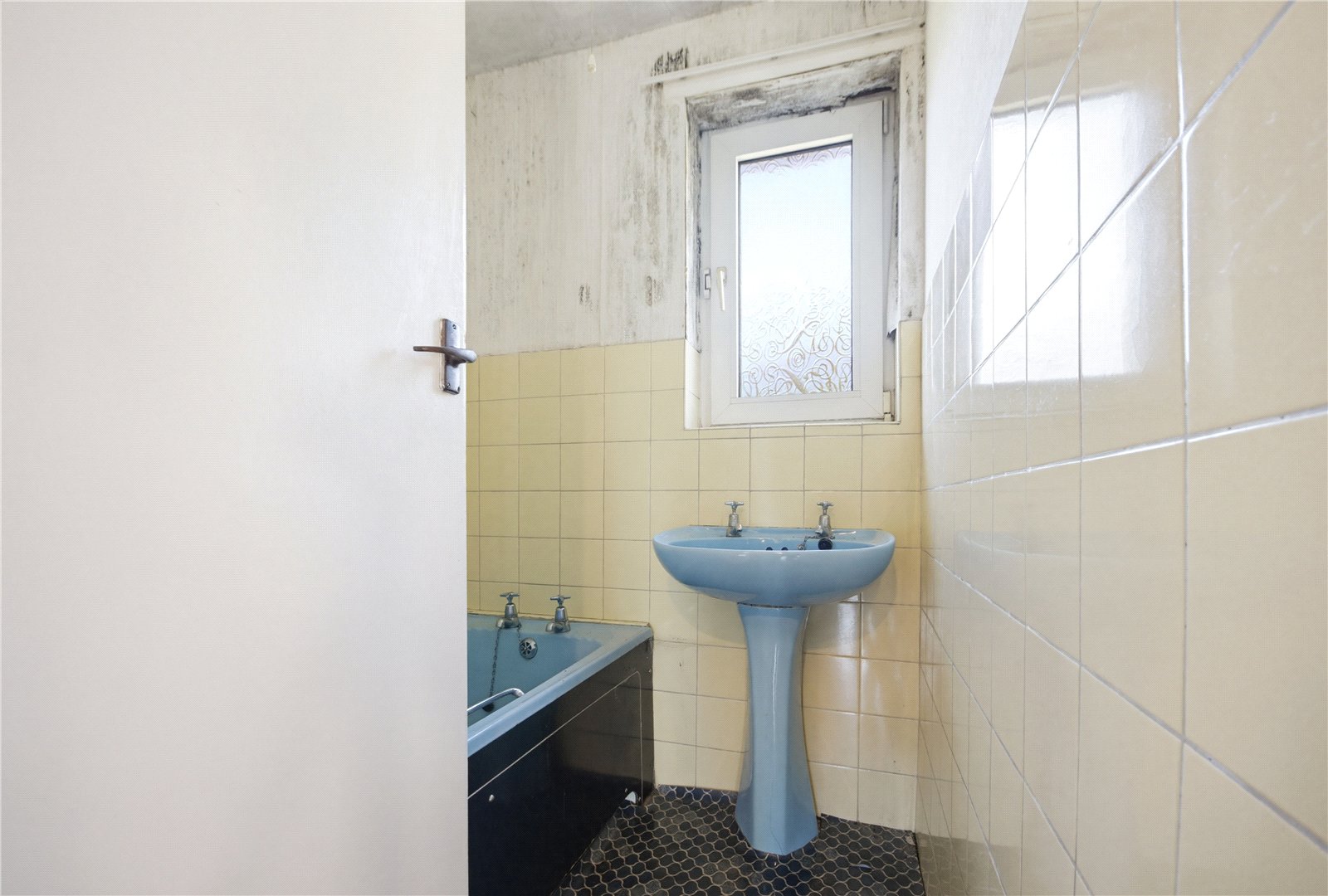 With 2 piece suite in blue, tiled walls and obscure glazed window to the front.