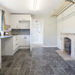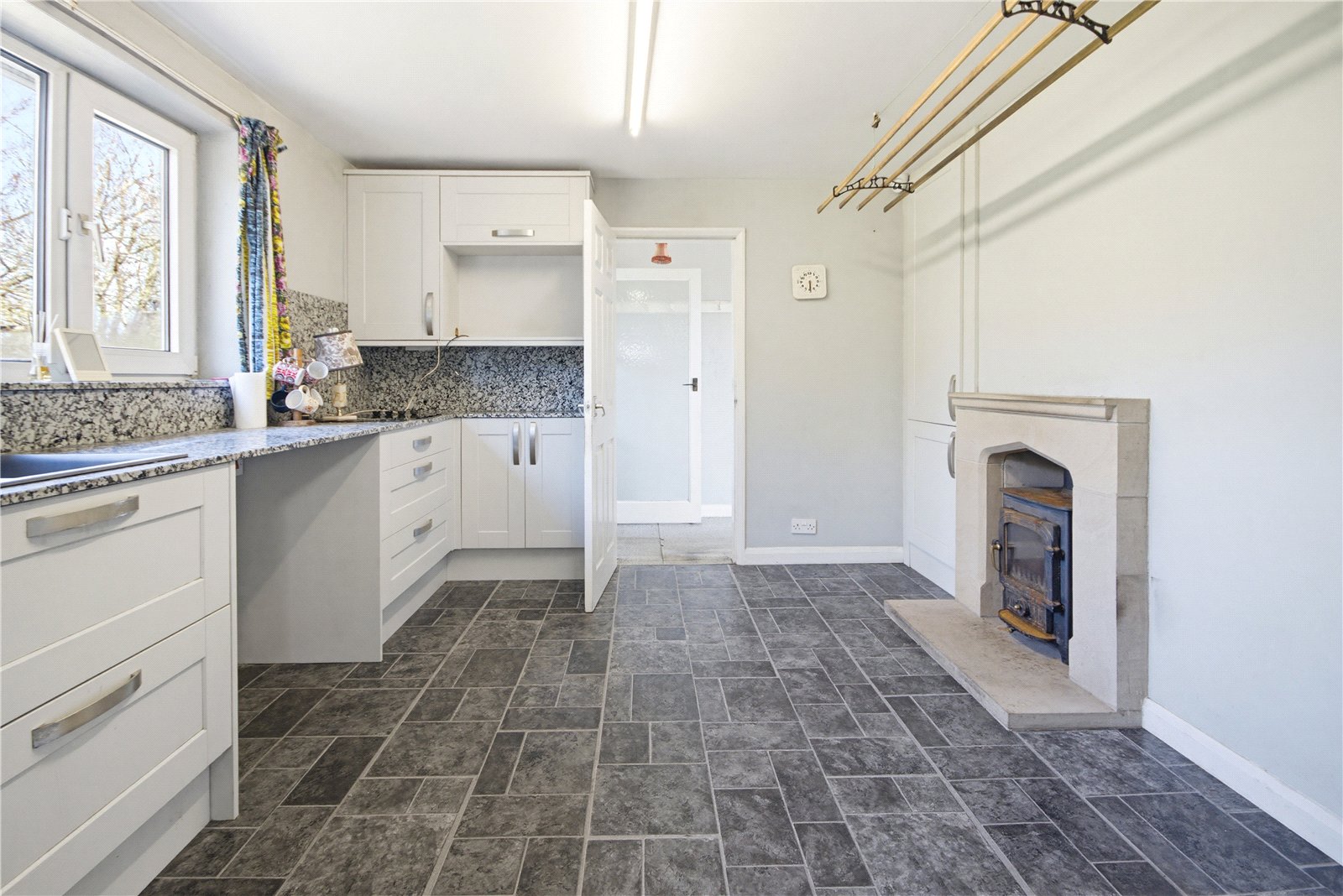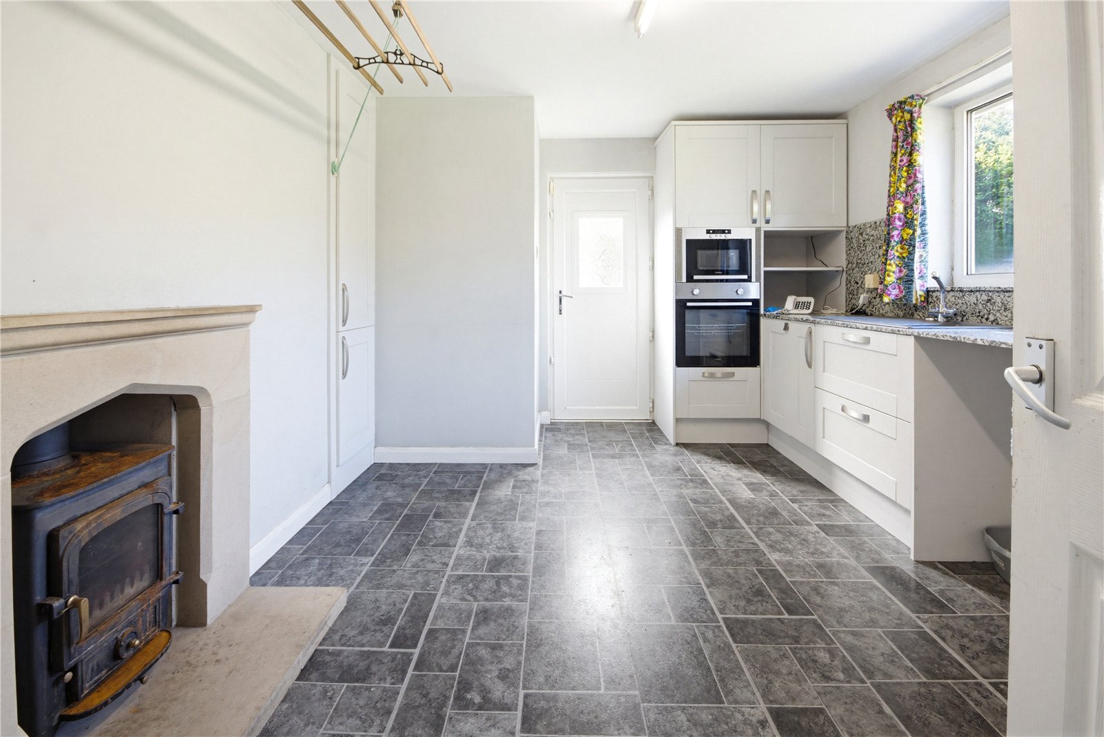 Fitted with a good range of modern units with granite worksurfaces, integrated oven, microwave, electric hob and sink unit with mixer tap. There is a broad chimney breast with cupboards to either side and inset log burning stove. A door leads to the side porch.