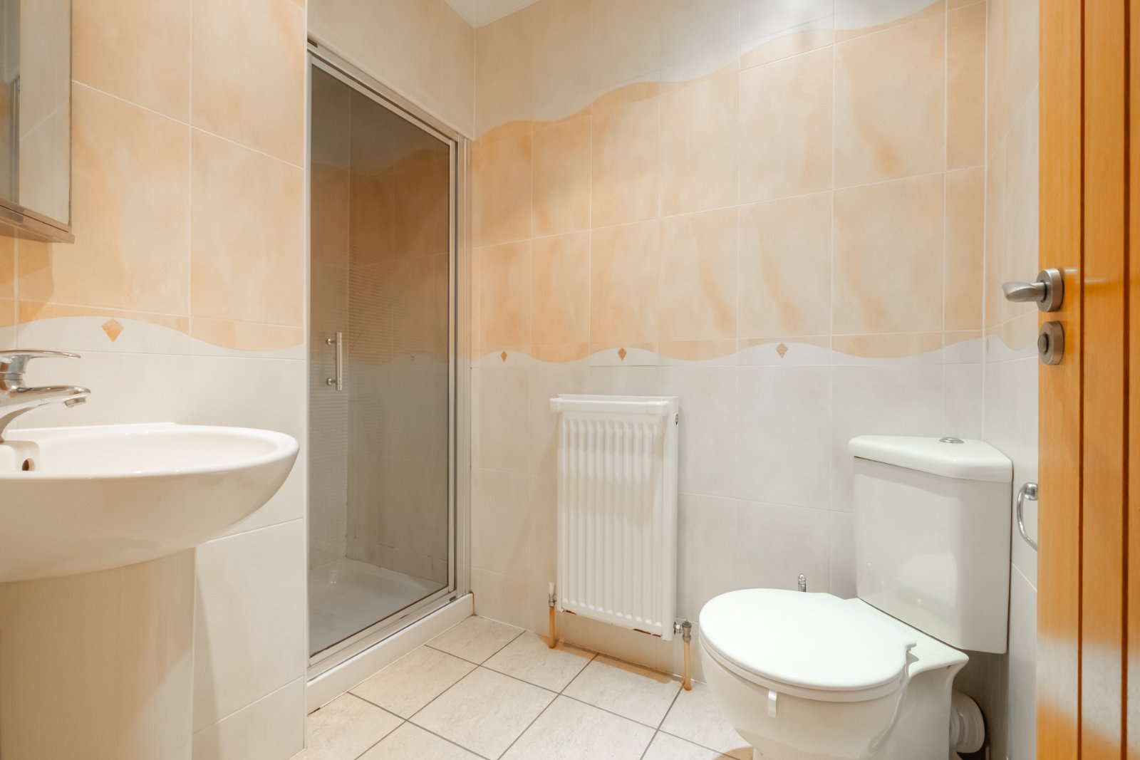 With low flush wc, pedestal washbasin and shower enclosure, fully tiled walls and central heating radiator.