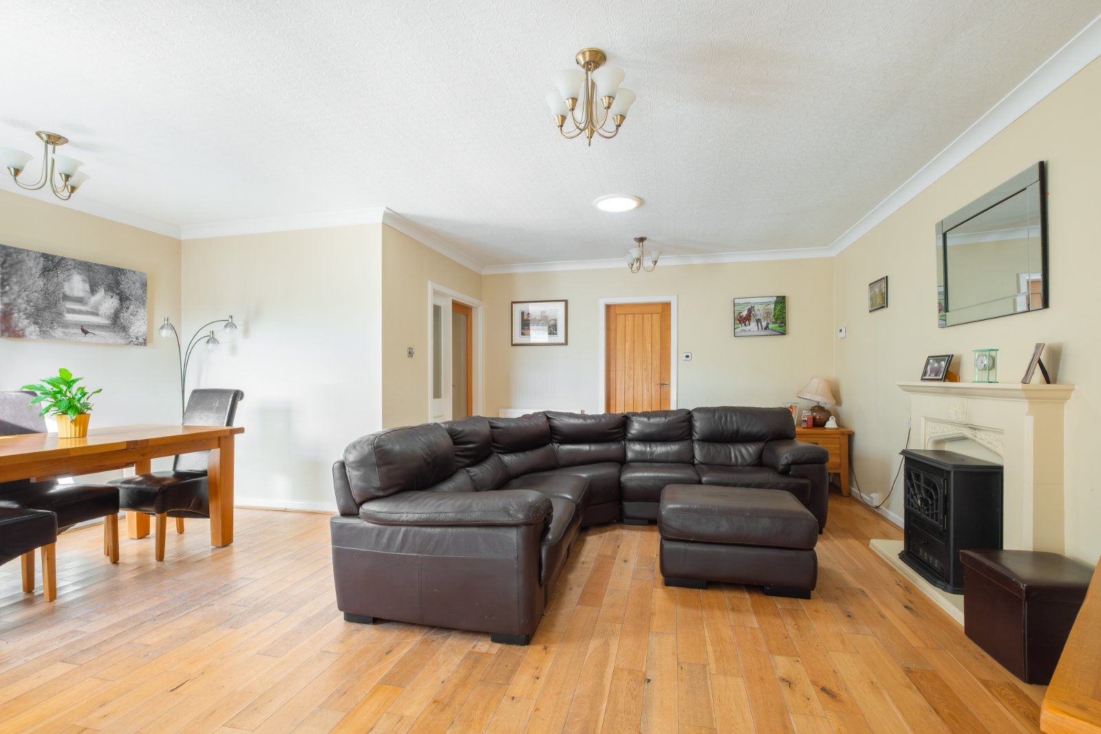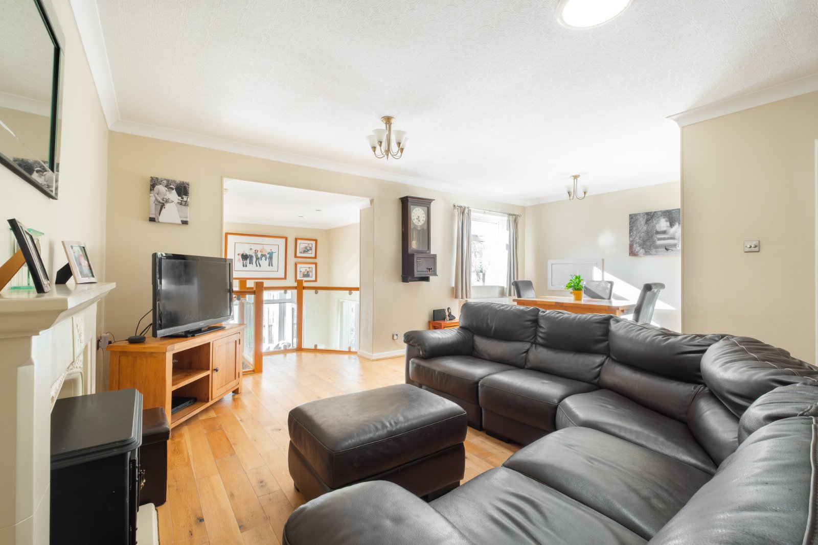A good sized open plan living and dining room, with window to the rear enjoying the views, feature fireplace, laminated wood flooring, 2 central heating radiators and stairs leading down to the lower floor.