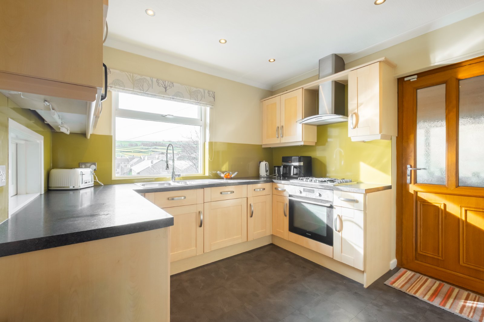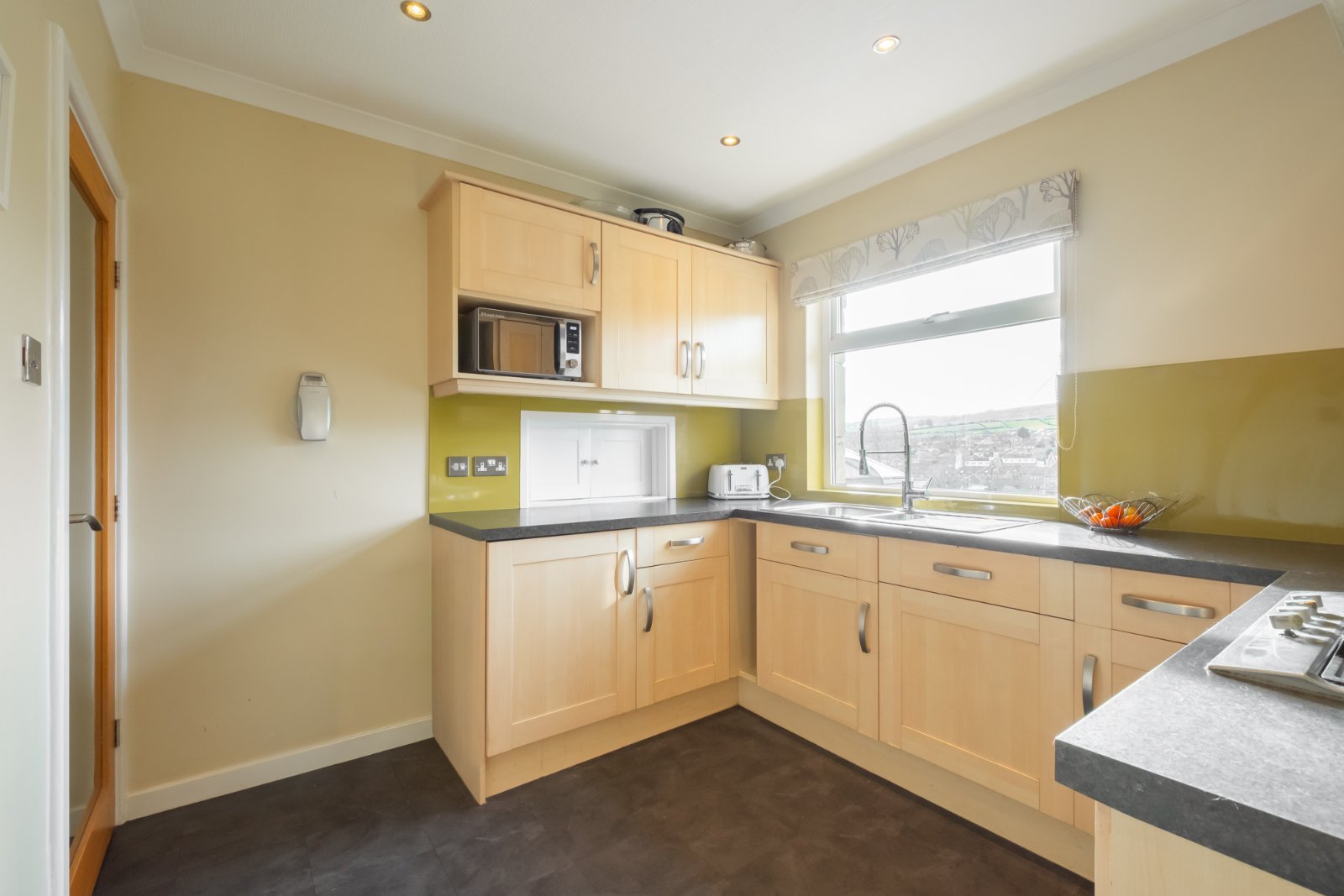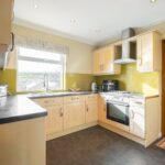 Fitted with a range of base units and wall cupboards with laminated worksurfaces, integrated oven, 4 ring gas hob with extractor, fridge, dishwasher, inset spotlights to the ceiling, window to the rear enjoying the views, central heating radiator and door to the side.