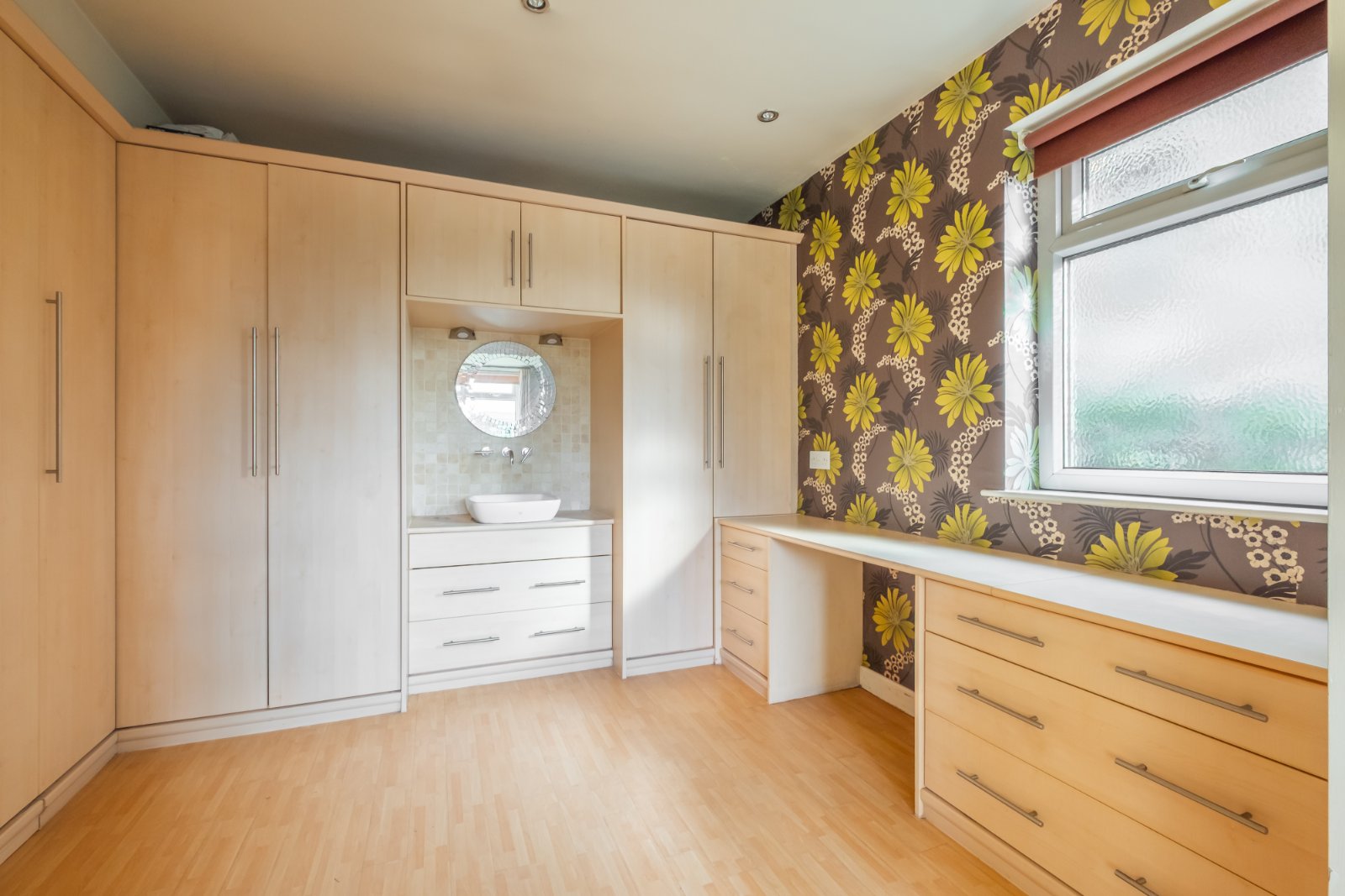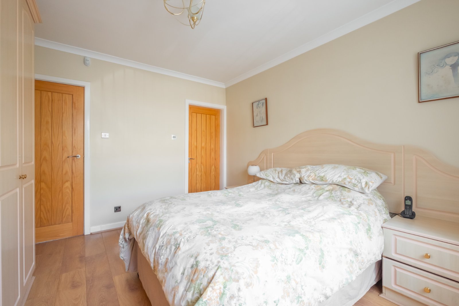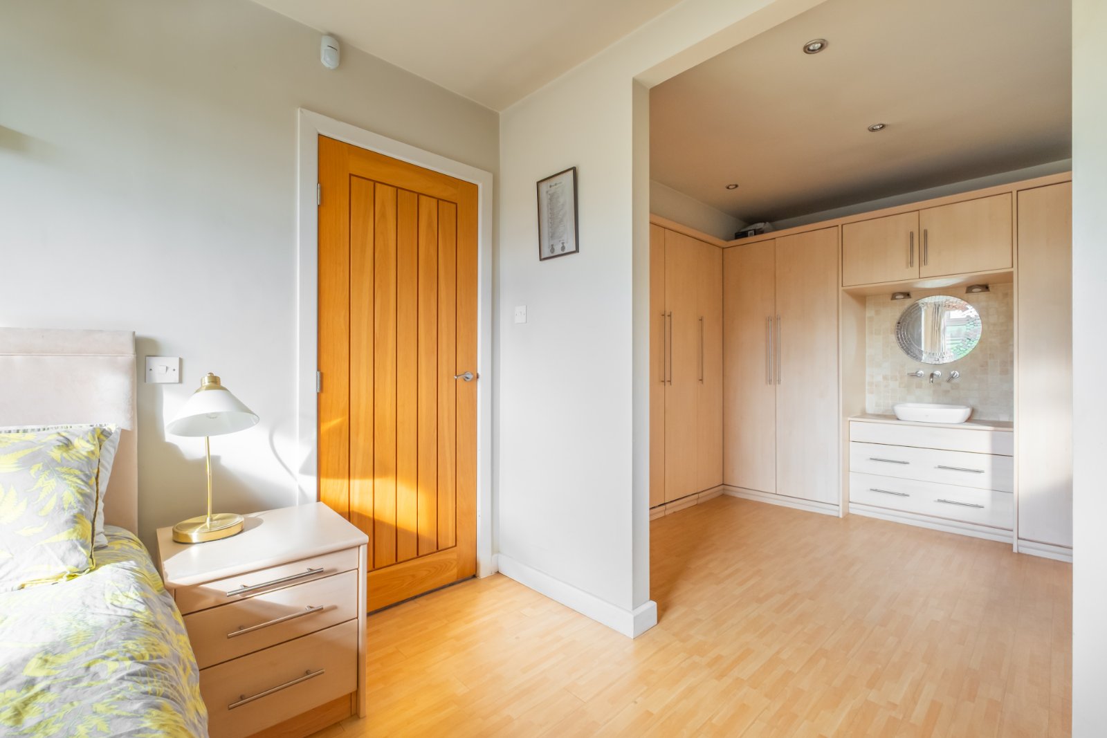 With fitted wardrobes, dressing table and a washbasin, window to the side, double doors open into the shower room which has a low flush wc, shower enclosure and heated towel rail.