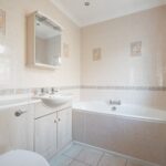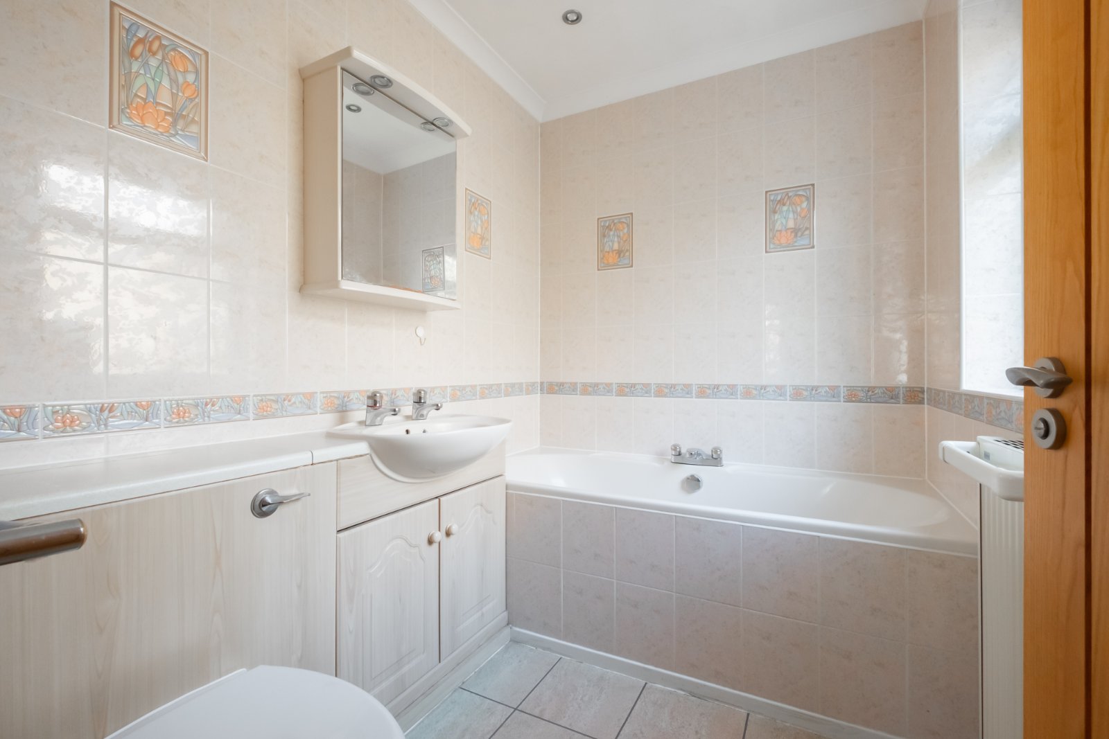 With low flush wc and washbasin in vanity unit, bath, obscure glazed window to the side, fully tiled walls and central heating radiator.