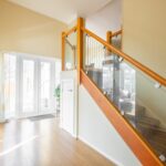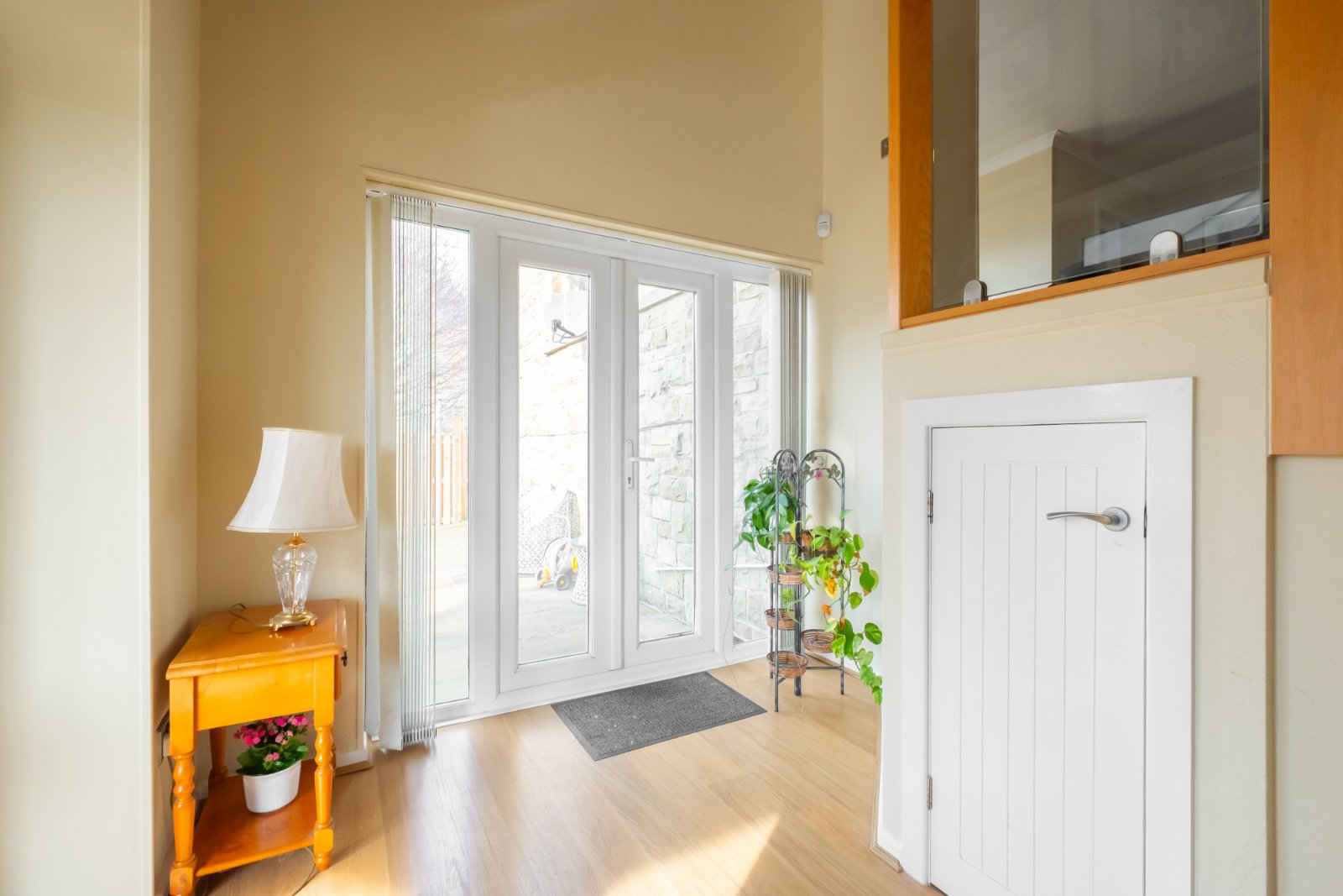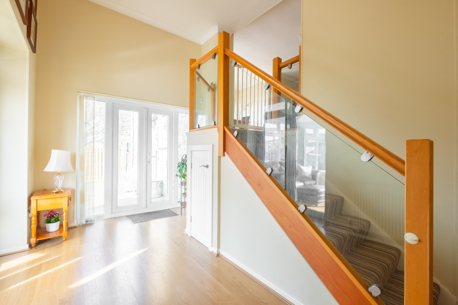 An impressive double height hall with high angled ceiling, stairs from the upper floor with glazed balustrading, glazed double doors to the side, glazed double doors into the conservatory, laminated flooring and central heating radiator.