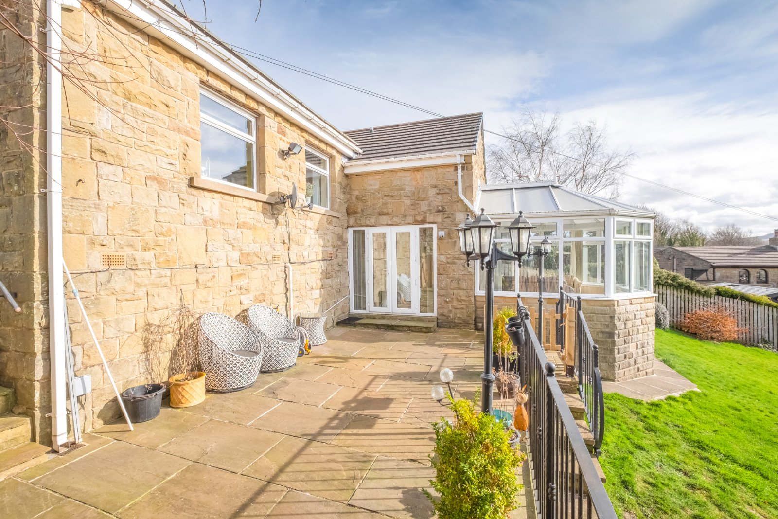 Paths to the side of the house lead down to the rear garden where there is a paved seating area and a large sloping lawn beyond.