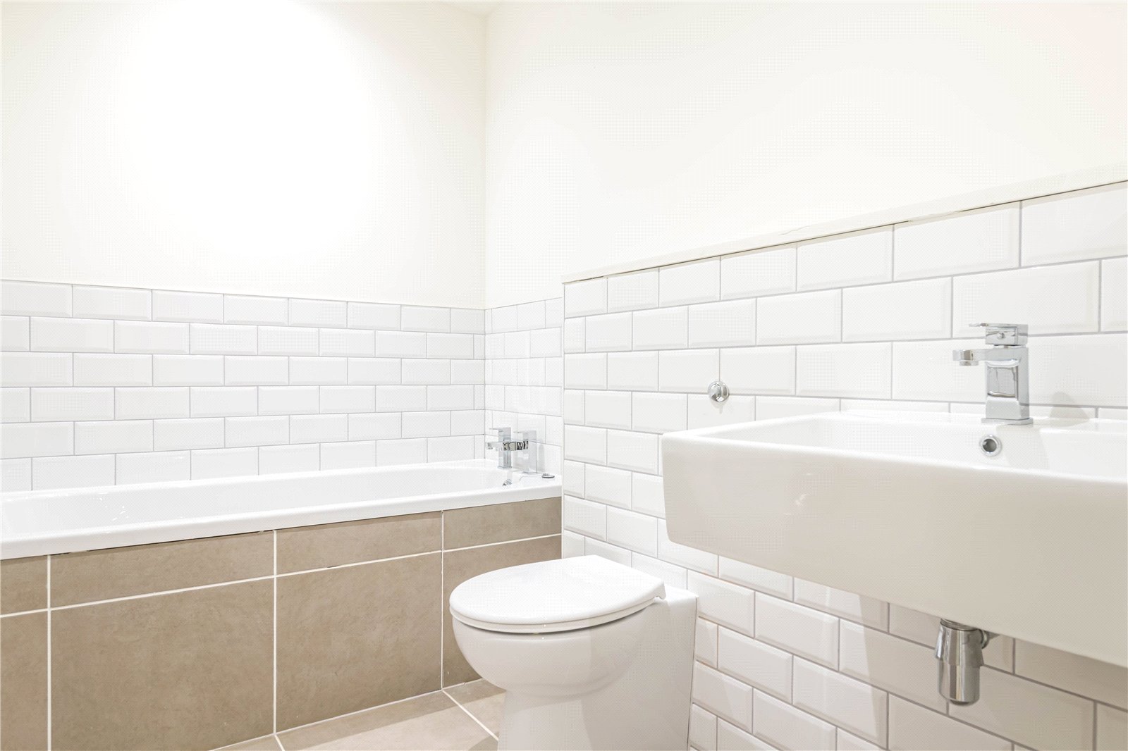 With three piece suite in white comprising low flush wc, wall hung washbasin and bath, tiled floor, tiled splashbacks, inset spotlights to the ceiling, heated towel rail and extractor.