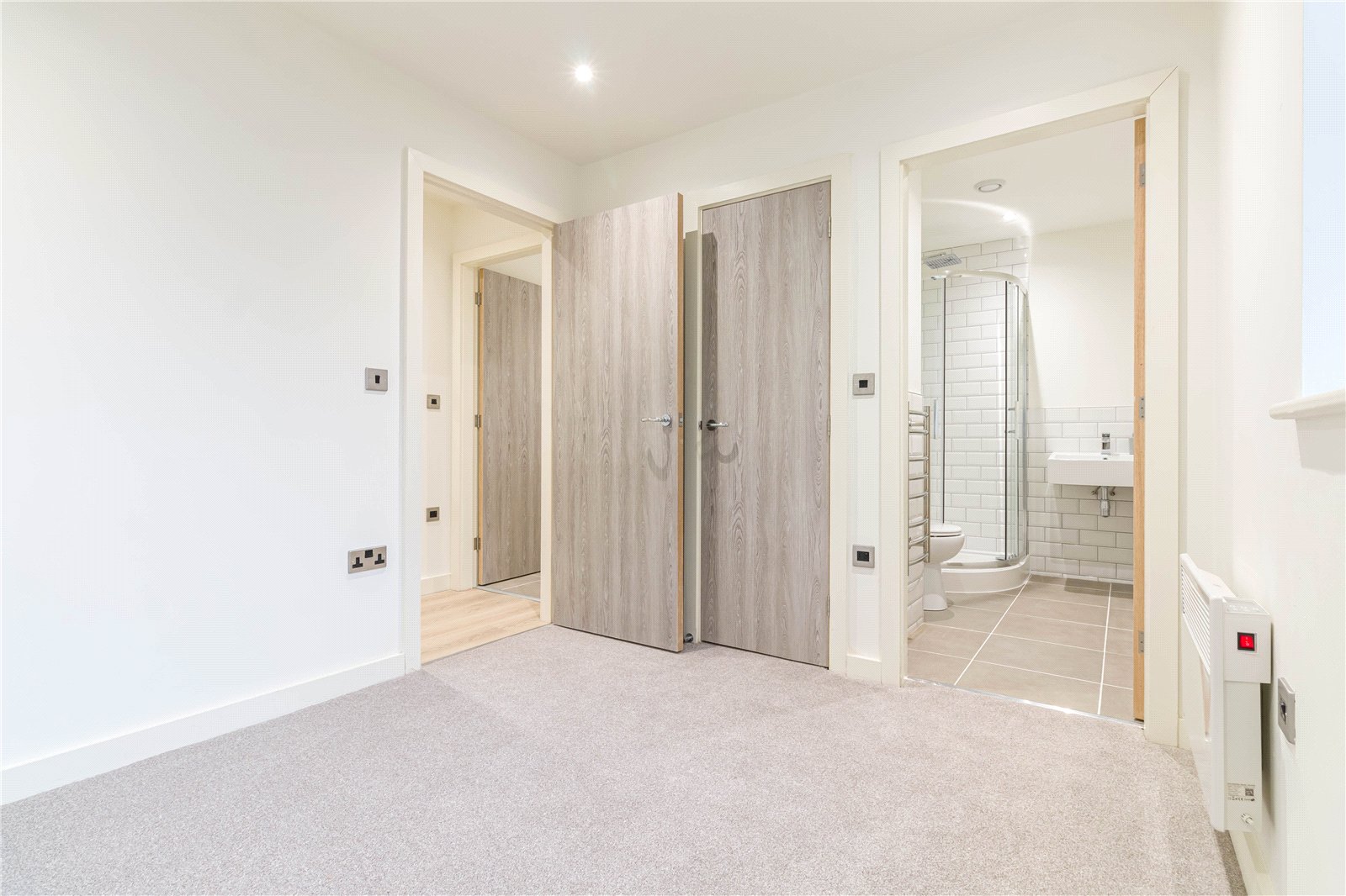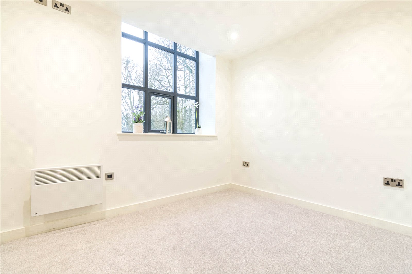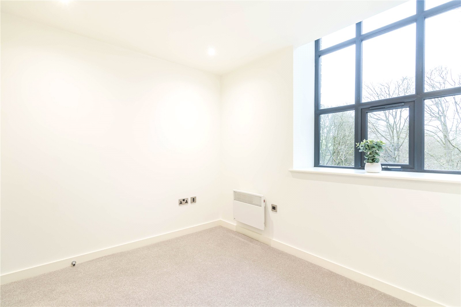 Another double bedroom with window to the front, inset spotlights to the ceiling and electric heater.
