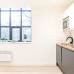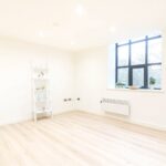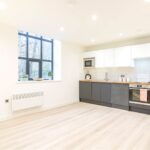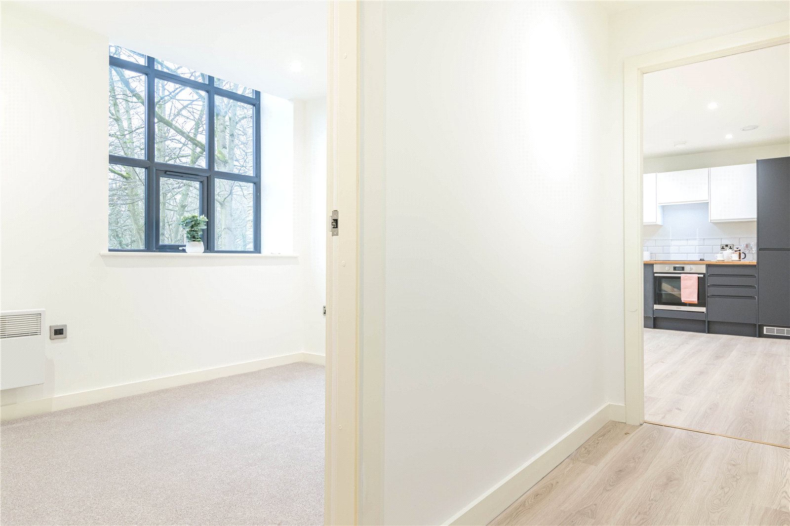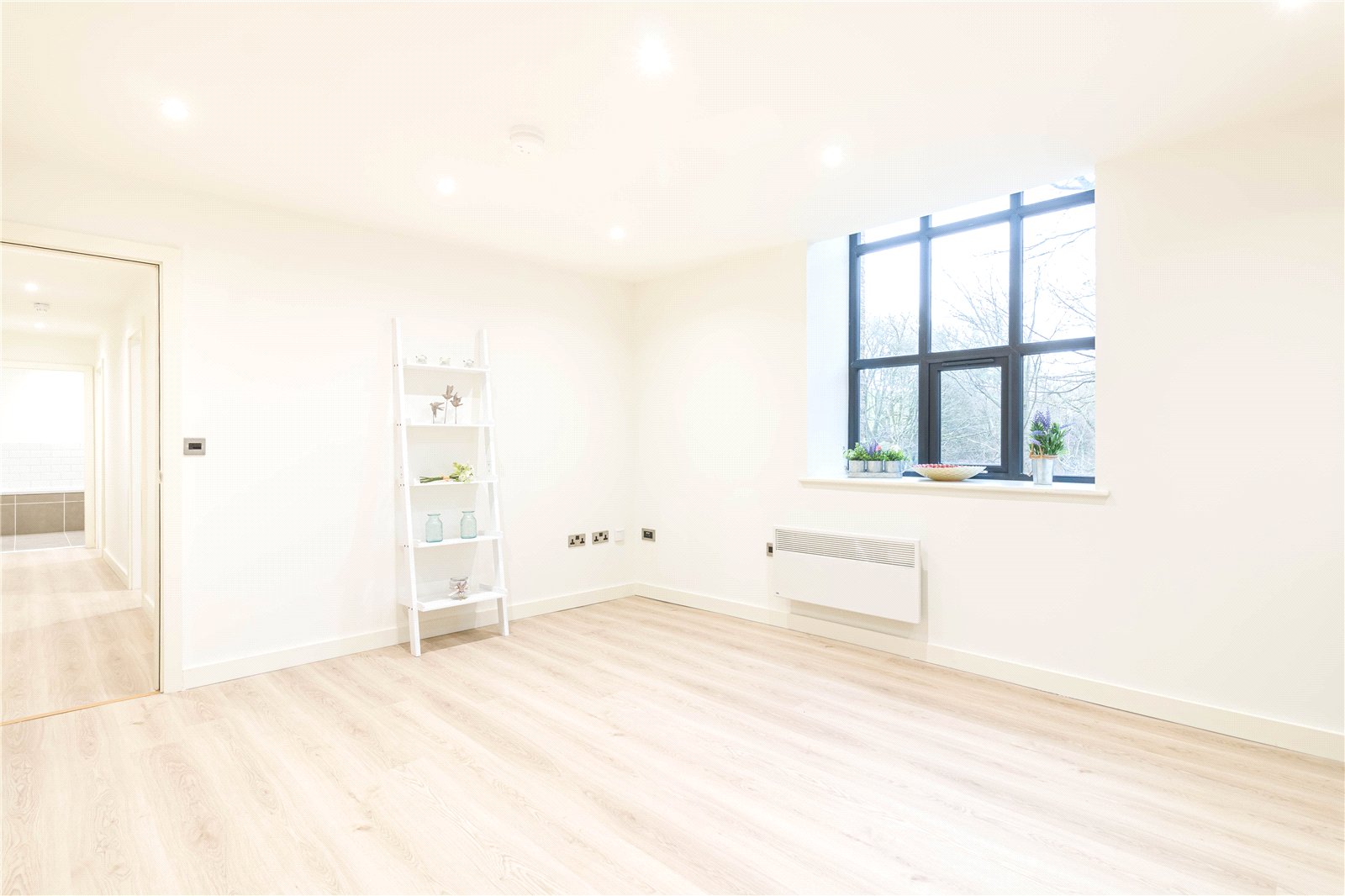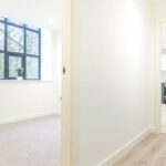 The apartments entrance door leads into a hallway with laminated flooring and inset spotlights.