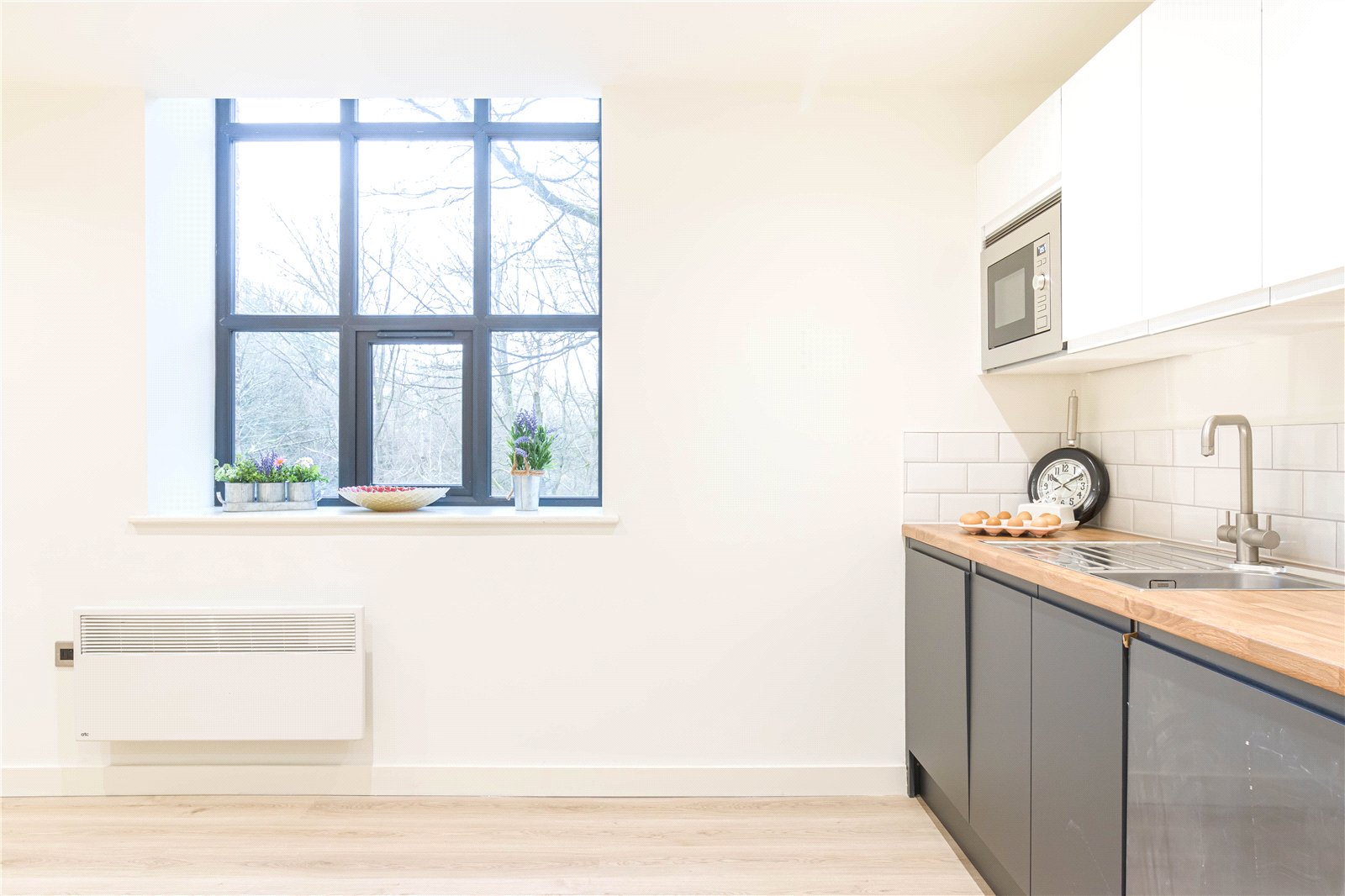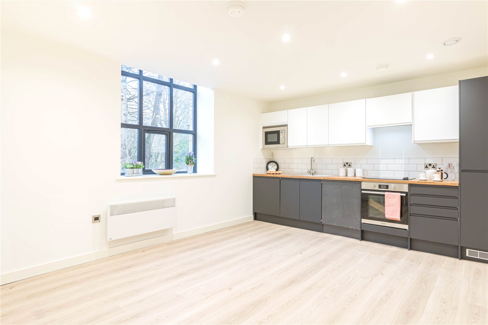 An open plan living space with windows to the front enjoying the views, laminated wood flooring, inset spotlights to the ceiling and a programable electric heater. The kitchen area features a range of fitted base units and wall cupboards with laminated worksurfaces, integrated double oven, hob, fridge freezer, microwave and tiled splashbacks.