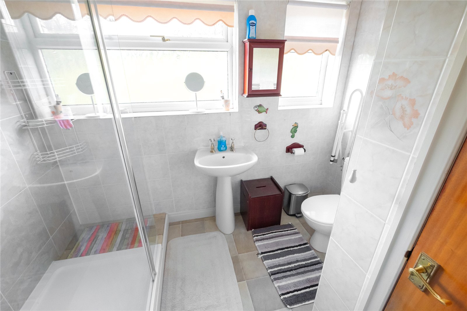 Comprising of a three-piece suite in white including low level flush WC, pedestal hand wash basin and good-sized walk-in shower cubicle. There is tiling to ceiling height in the main throughout the bathroom and there are two obscure double-glazed windows. In the bathroom there is a central heating radiator style radiator.