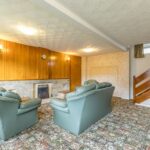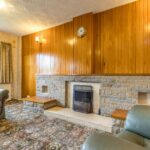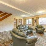A large living room with windows to the front and side, feature fireplace with tiled hearth and open fire, central heating radiator and staircase to the first floor.