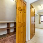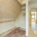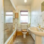With partly angled ceiling, low flush wc, pedestal washbasin and bath with shower over, partly tiled walls, airing cupboard with hot water cylinder, central heating radiator.