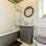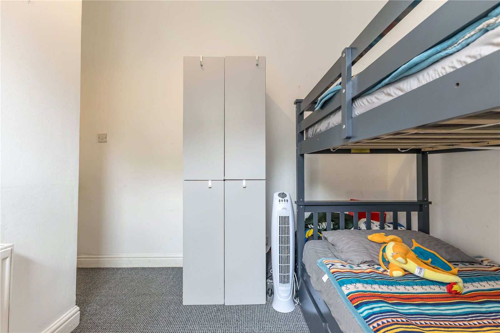 Fitted with a white suite comprising a panelled bath with mixer tap and shower hose over, wash basin with cupboard beneath, and low flush w.c. There is a frosted window to the rear, tiled walls and tiled floor.