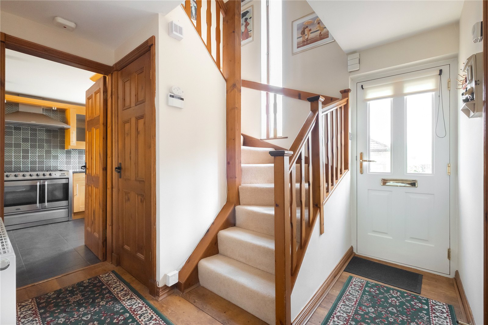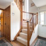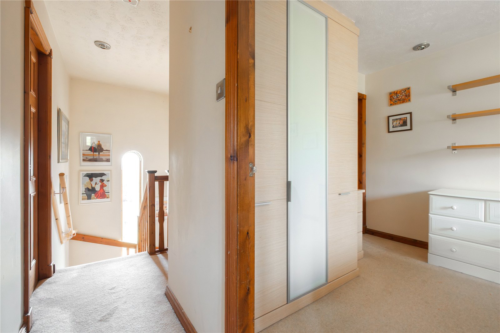 There is a tall arched window over the stairs to the first floor landing which features a recessed storage cupboard and central heating radiator.