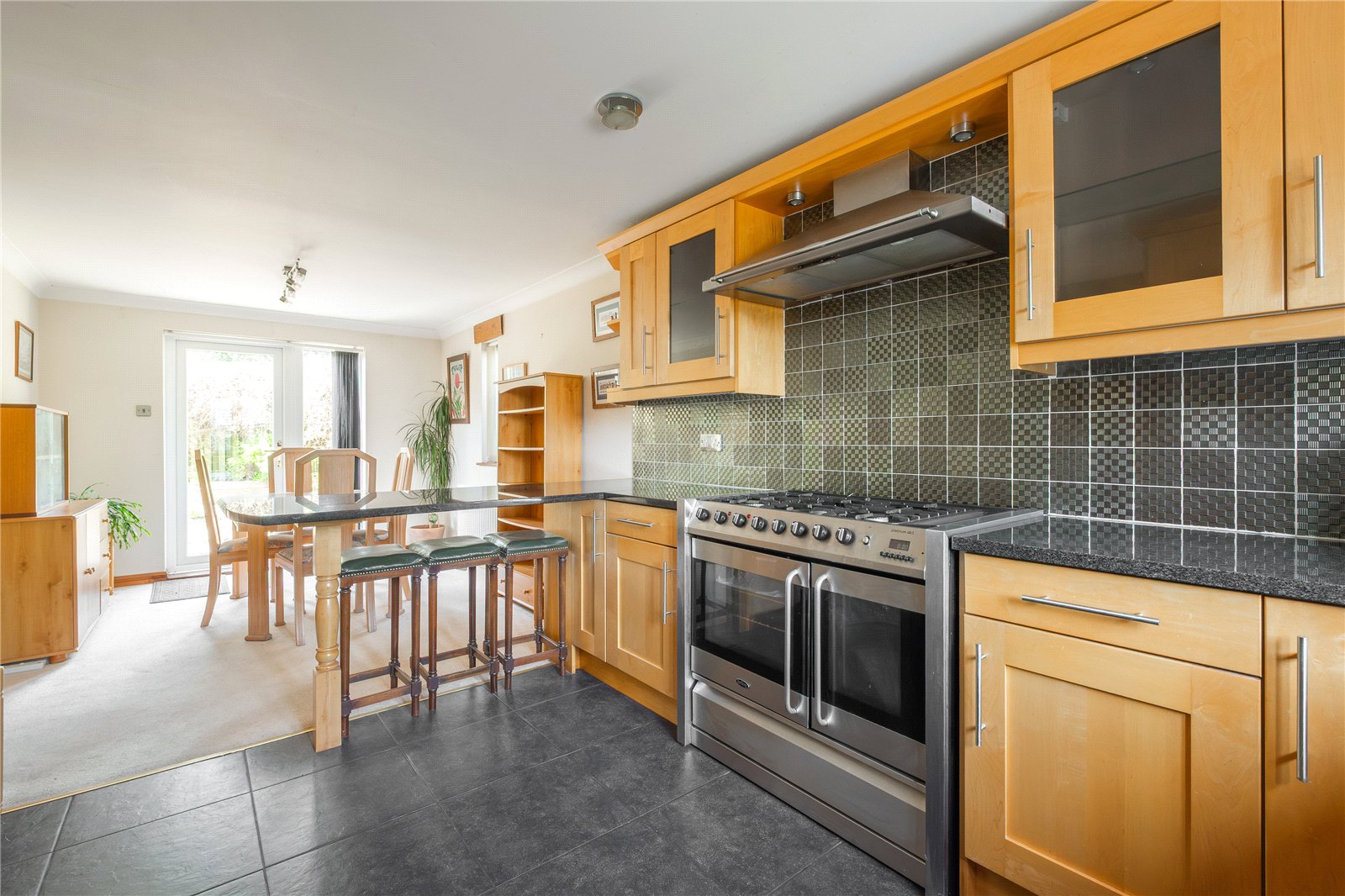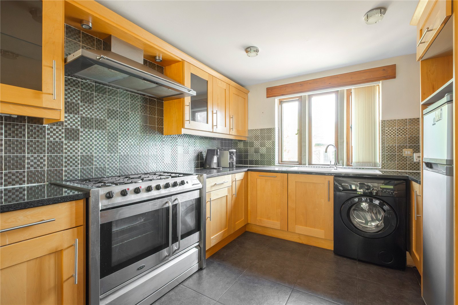 Featuring a good range of fitted base units and wall cupboards with granite worksurfaces and breakfast bar, Belling range style cooker with 5 ring gas hob and extractor over, sink unit with mixer tap, plumbing for automatic washing machine, tiled floor, windows to the front, window and door to the rear, central heating radiator.