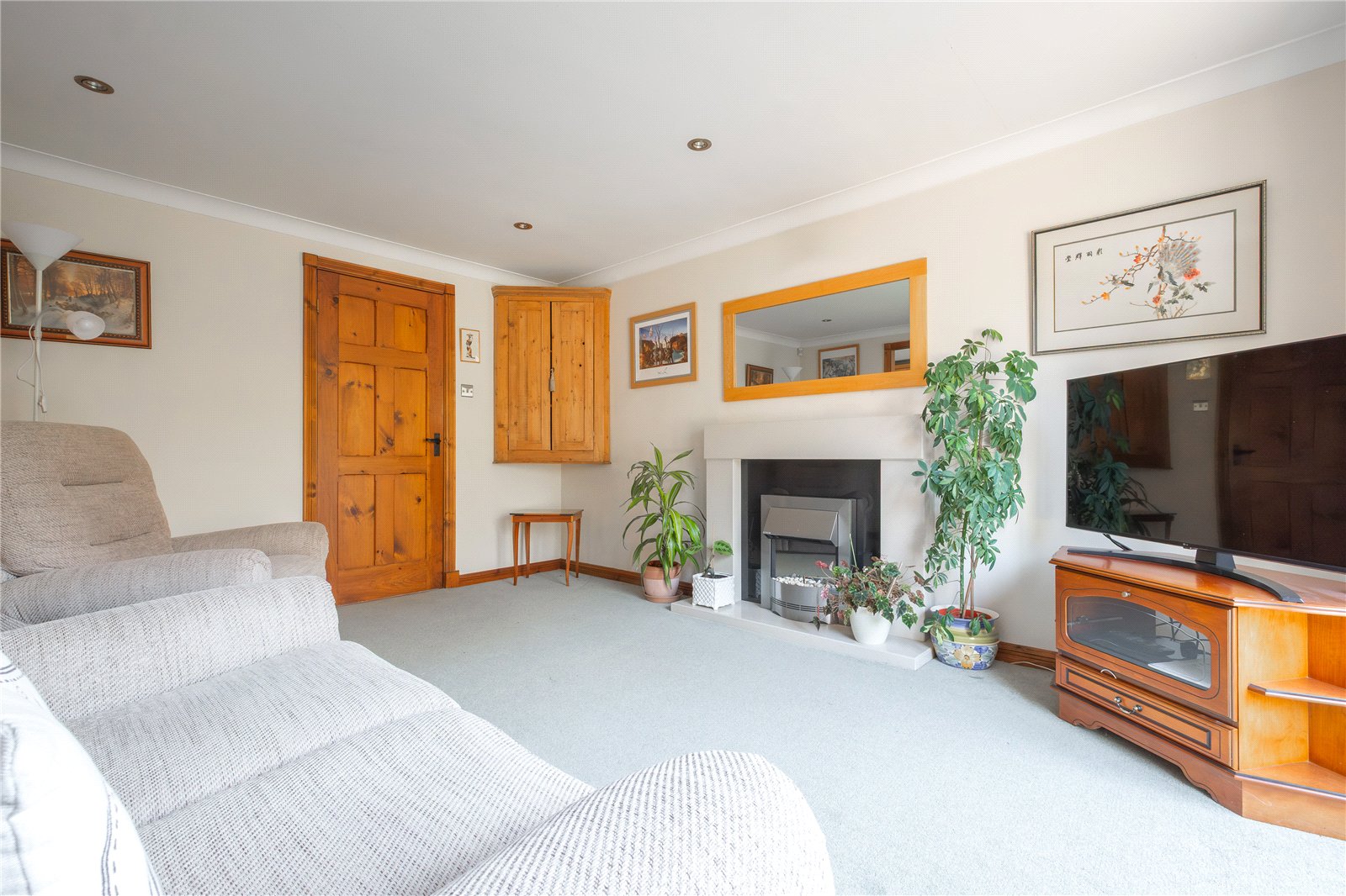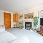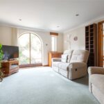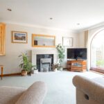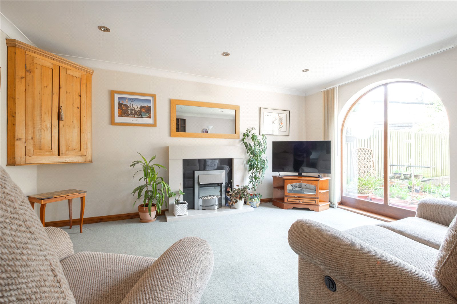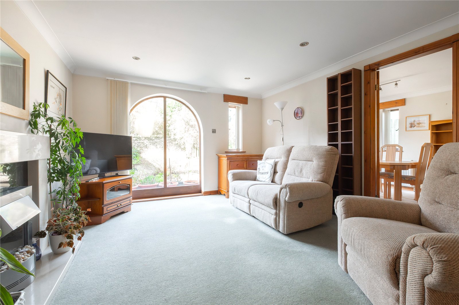 A well proportioned living room with arched window to the rear overlooking the garden, feature fireplace with electric fire, inset spotlights to the ceiling, central heating radiator and door into the dining kitchen.