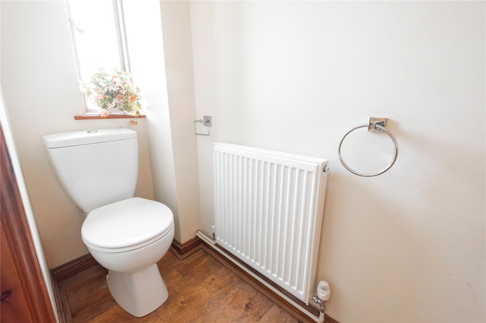 With low flush wc, vanity washbasin, laminated flooring, obscure glazed window to the front and central heating radiator.