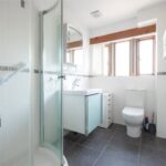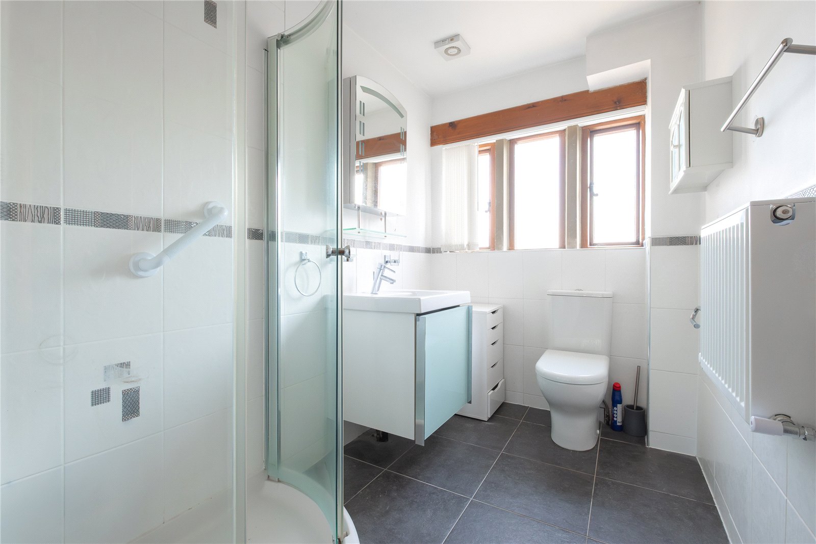 With low flush wc, vanity washbasin, shower enclosure, partly tiled walls, tiled floor, obscure glazed windows to the front, inset spotlights to the ceiling, extractor and central heating radiator.
