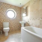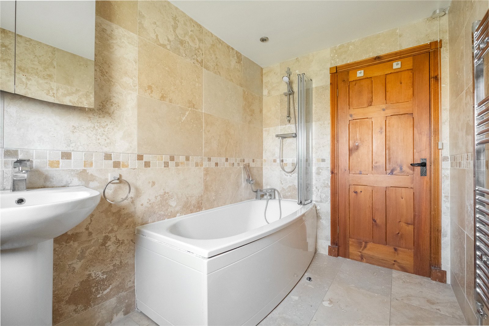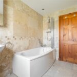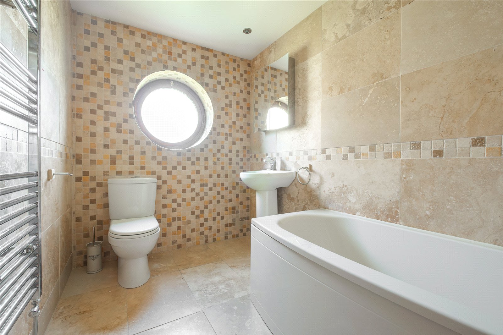 With low flush wc, pedestal washbasin and bath with shower over, tiled walls, tiled floor, porthole window to the side and heated towel rail.