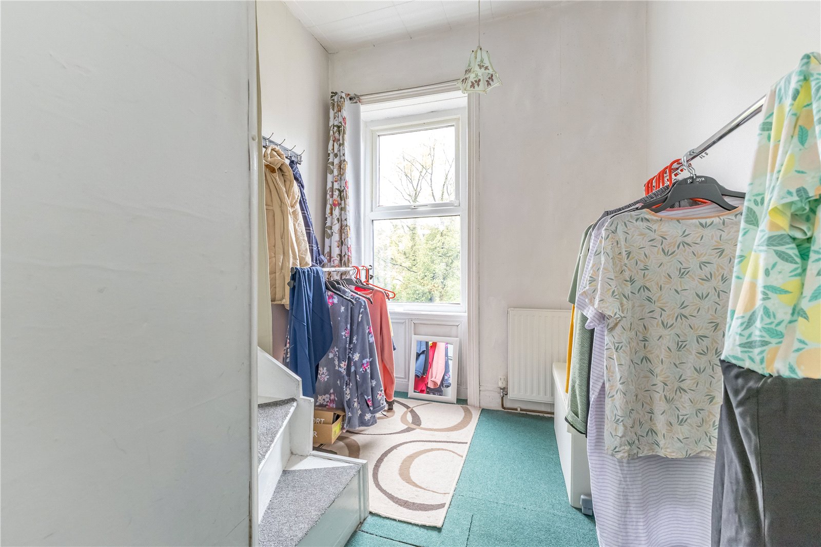 The double-glazed window offers views across the garden below and beyond. There is a central heating radiator and a concertina style folding door allows access.