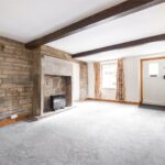 With window and door to the front, electric heater, exposed stonework to one wall, stone fireplace, beams to the ceiling and a door with stairs leading to the first floor.