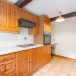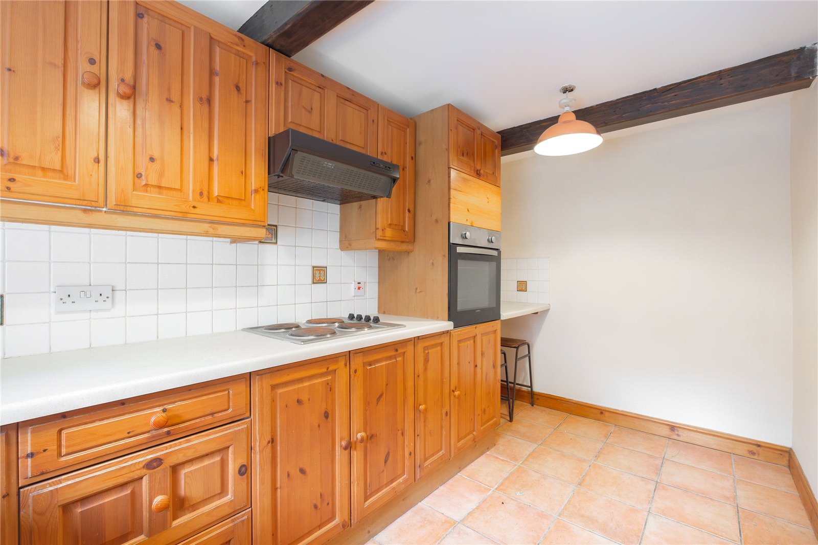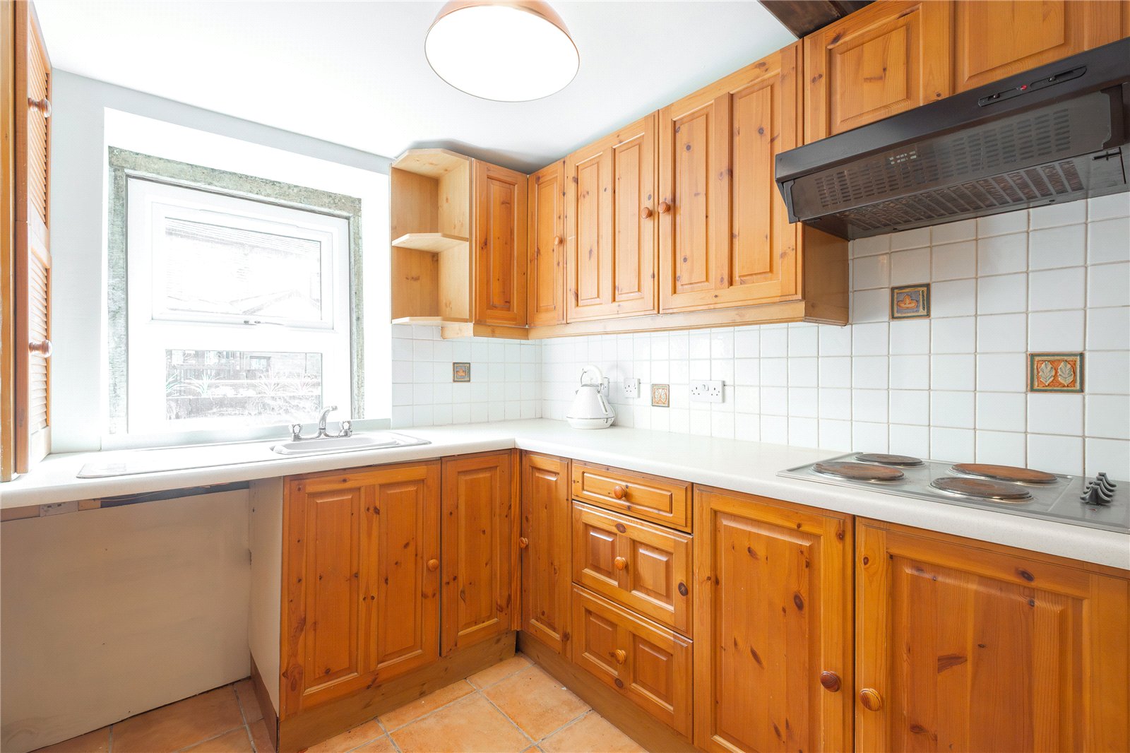 Fitted with a range of base units and wall cupboards with laminated worksurfaces, stainless steel sink, oven, 4 ring electric hob with extractor, window to the front and tiled floor.