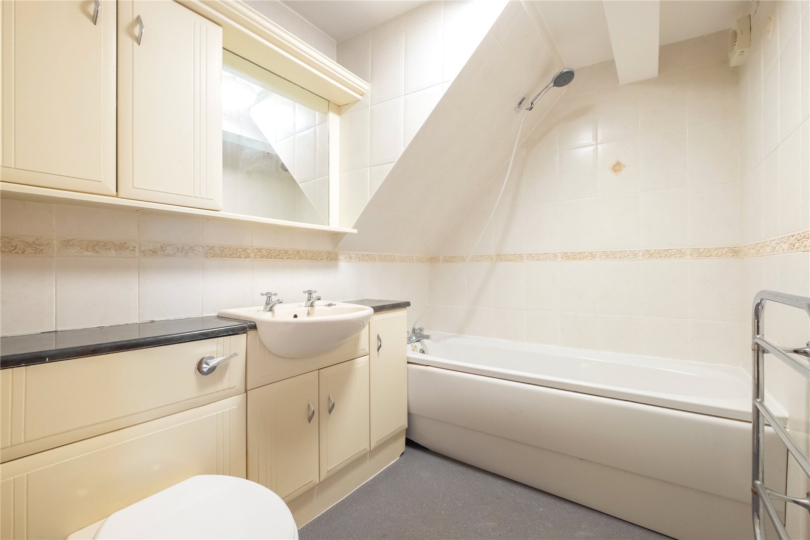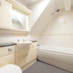 With low flush wc, vanity washbasin and bath with mixer shower over, fully tiled walls.