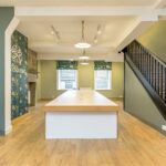 A large open plan office space which features traditional widows to the front, 2 uPVC double glazed windows to the rear, various built in cupboards, laminated wood flooring, 4 central heating radiators, broad staircase to the first floor and an additional staircase down to the cellar. In the centre of the room is a large bespoke desk unit.