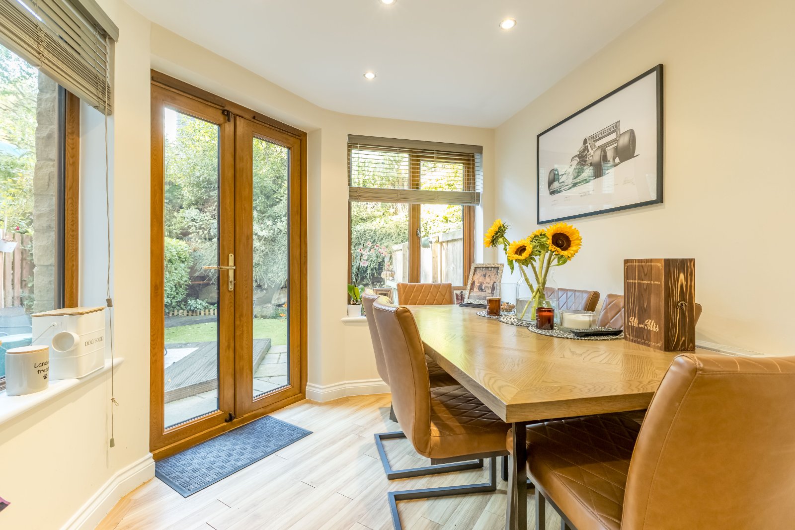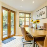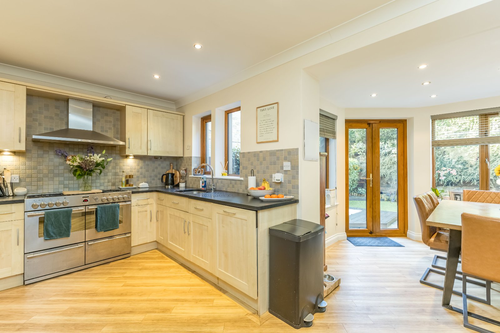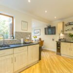 Open plan to the kitchen, this welcoming space features windows to the side and rear with angled double doors opening into the garden, spotlights to the ceiling and central heating radiator.