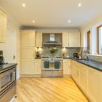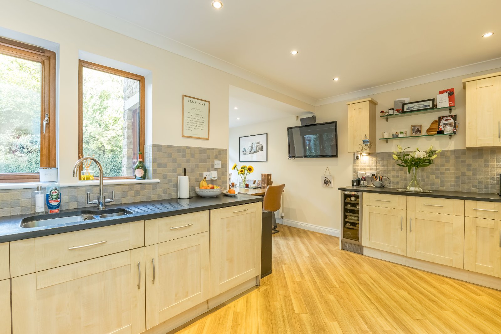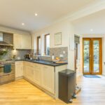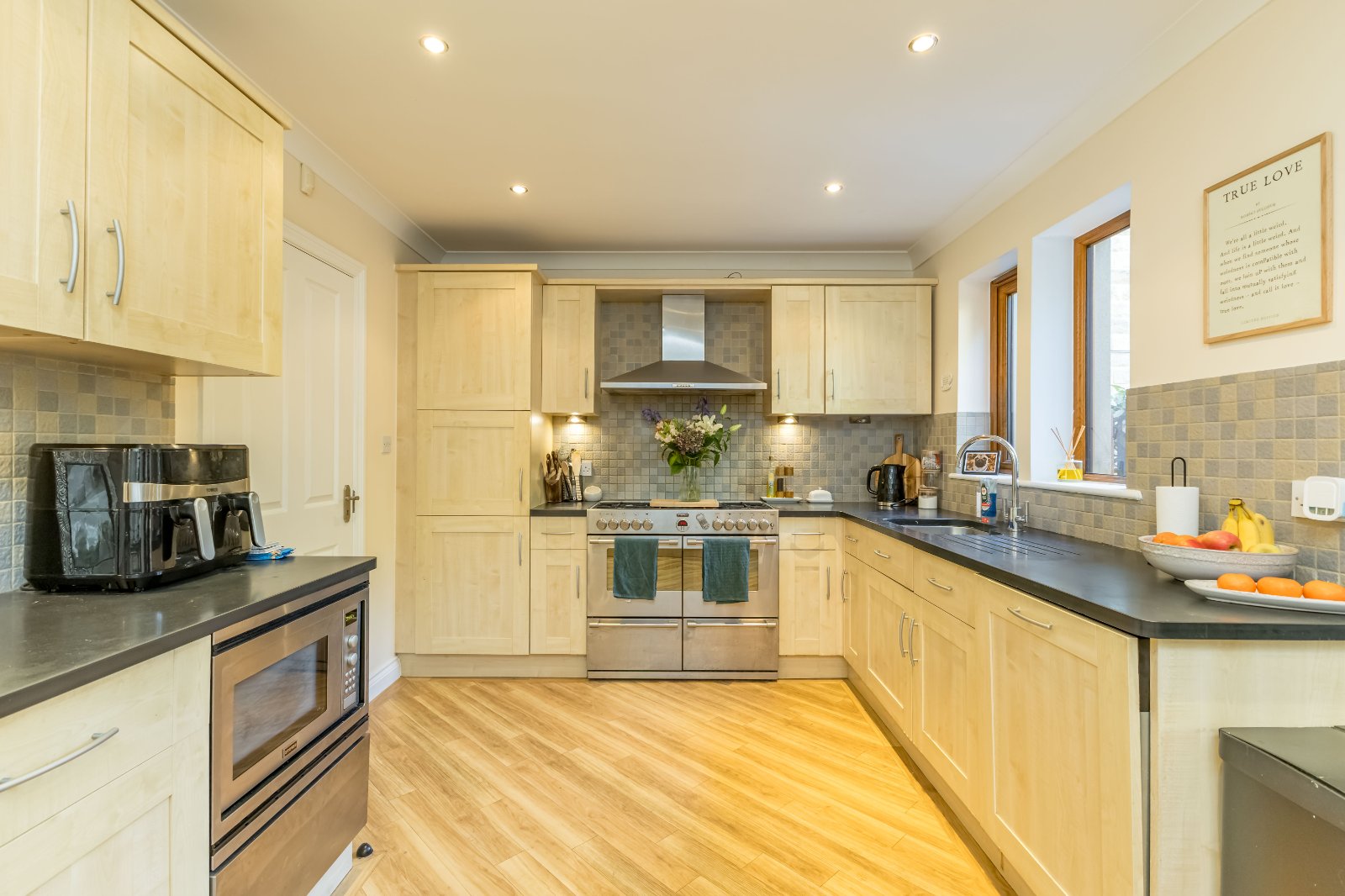 Fitted with a good range of shaker style base units and wall cupboards with composite worksurfaces and inset 1 ½ bowl sink with mixer tap, integrated fridge freezer, dishwasher, microwave, free standing stoves range style cooker with 7 gas hobs and extractor over, wine fridge, tiled splashbacks, windows to the rear, LVT flooring and inset spotlights to the ceiling.