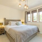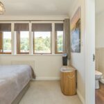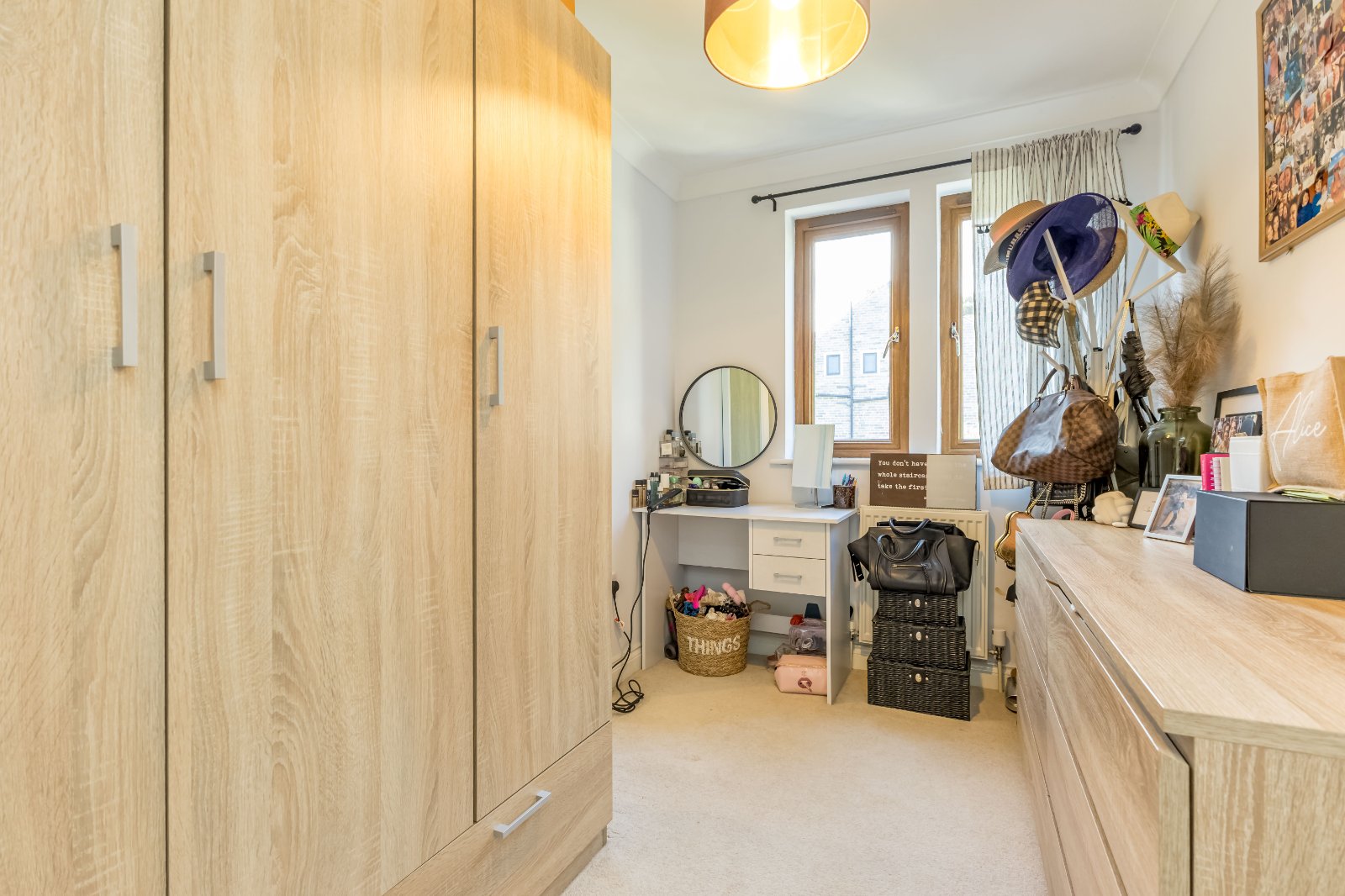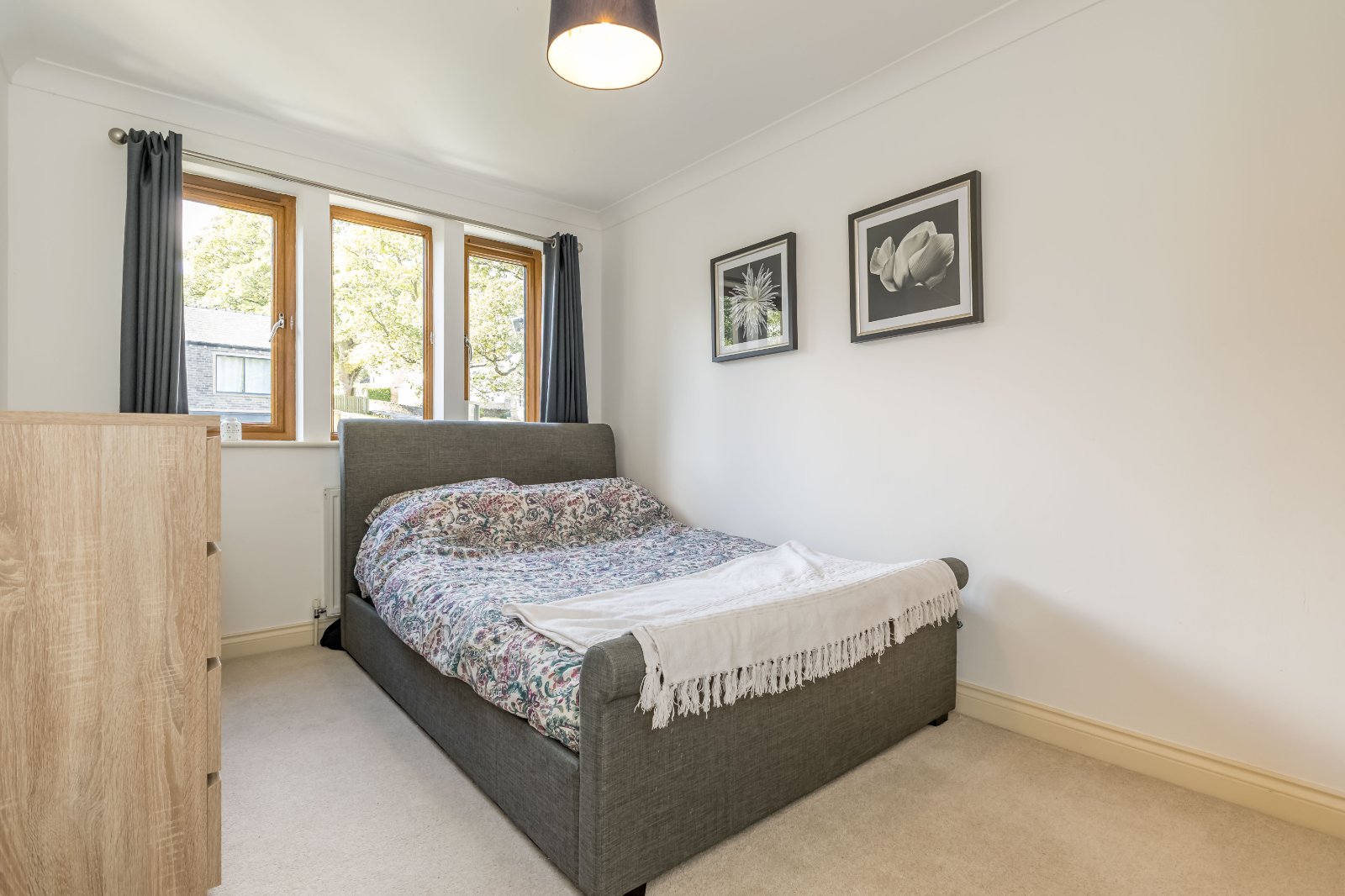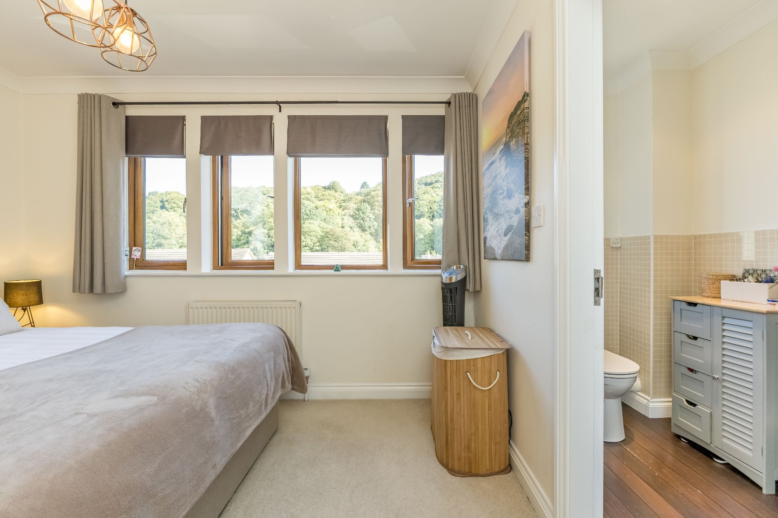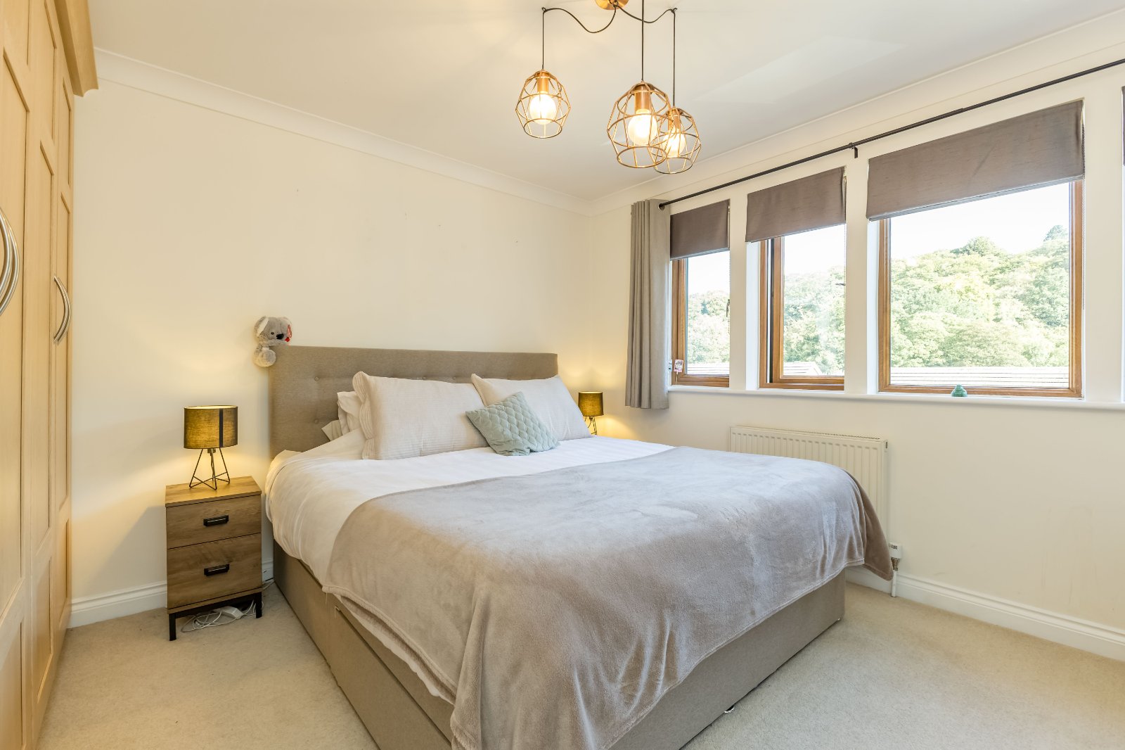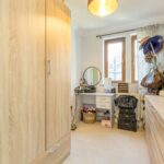 A double bedroom which features a bank of windows to the front elevation enjoying the views to the front, recessed built in wardrobes and central heating radiator.