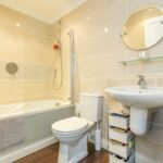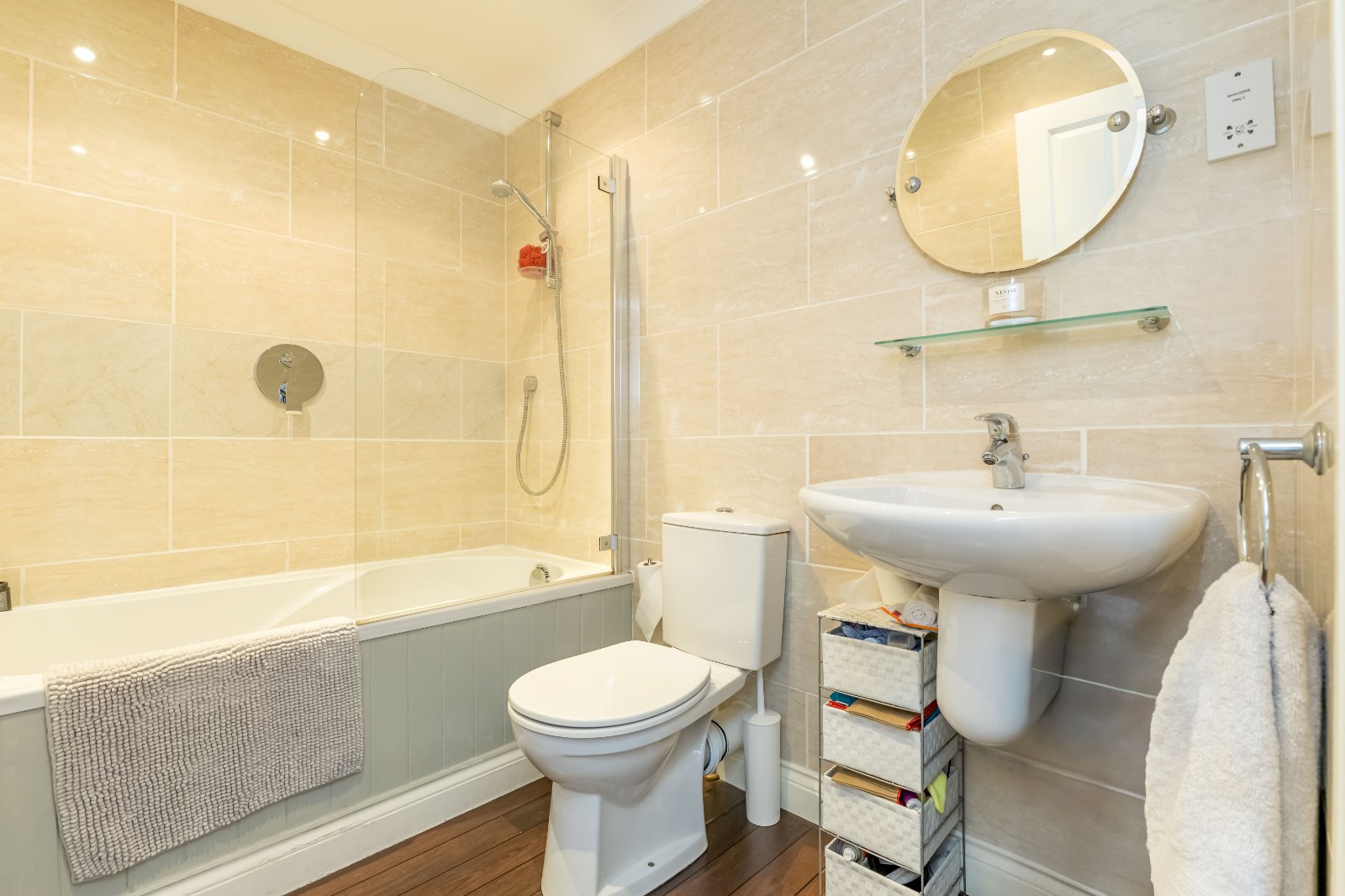 With low flush wc, wall hung washbasin, bath with shower over, fully tiled walls, shaver point, inset spotlights to the ceiling, extractor, laminated wood flooring and extractor.