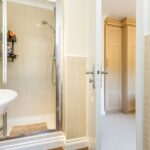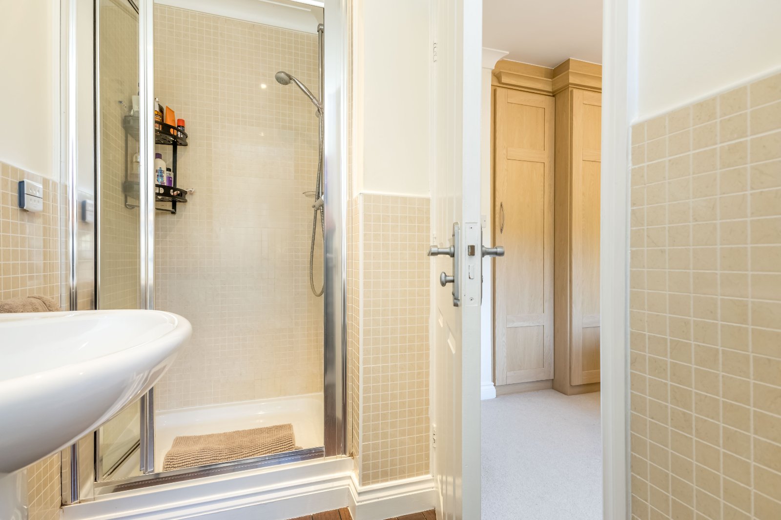 With low flush wc, pedestal washbasin and recessed shower enclosure, partly tiled walls, obscure glazed window to the front, shaver point, laminated wood flooring, heated towel rail, inset spotlights to the ceiling and extractor.
