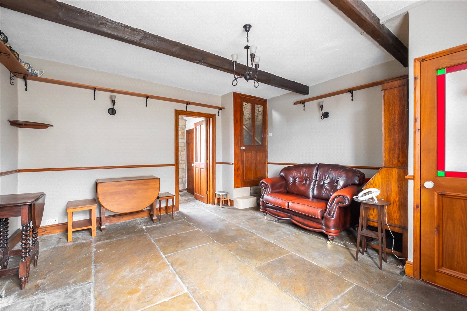 This particularly impressive room has a stone flagged floor which runs through to the kitchen. There is a log burning stove sat within a stone surround with exposed stone back cloth and to the chimney breast. The room has exposed beams to the ceiling, central heating radiator and a part glazed door gives access through to the staircase which rises to the first-floor landing.
